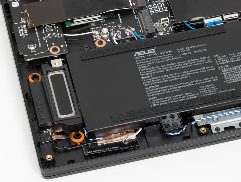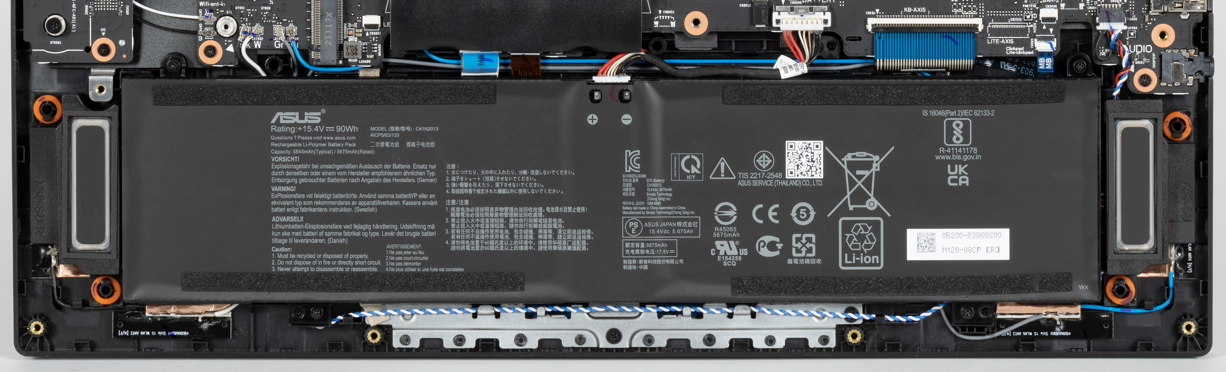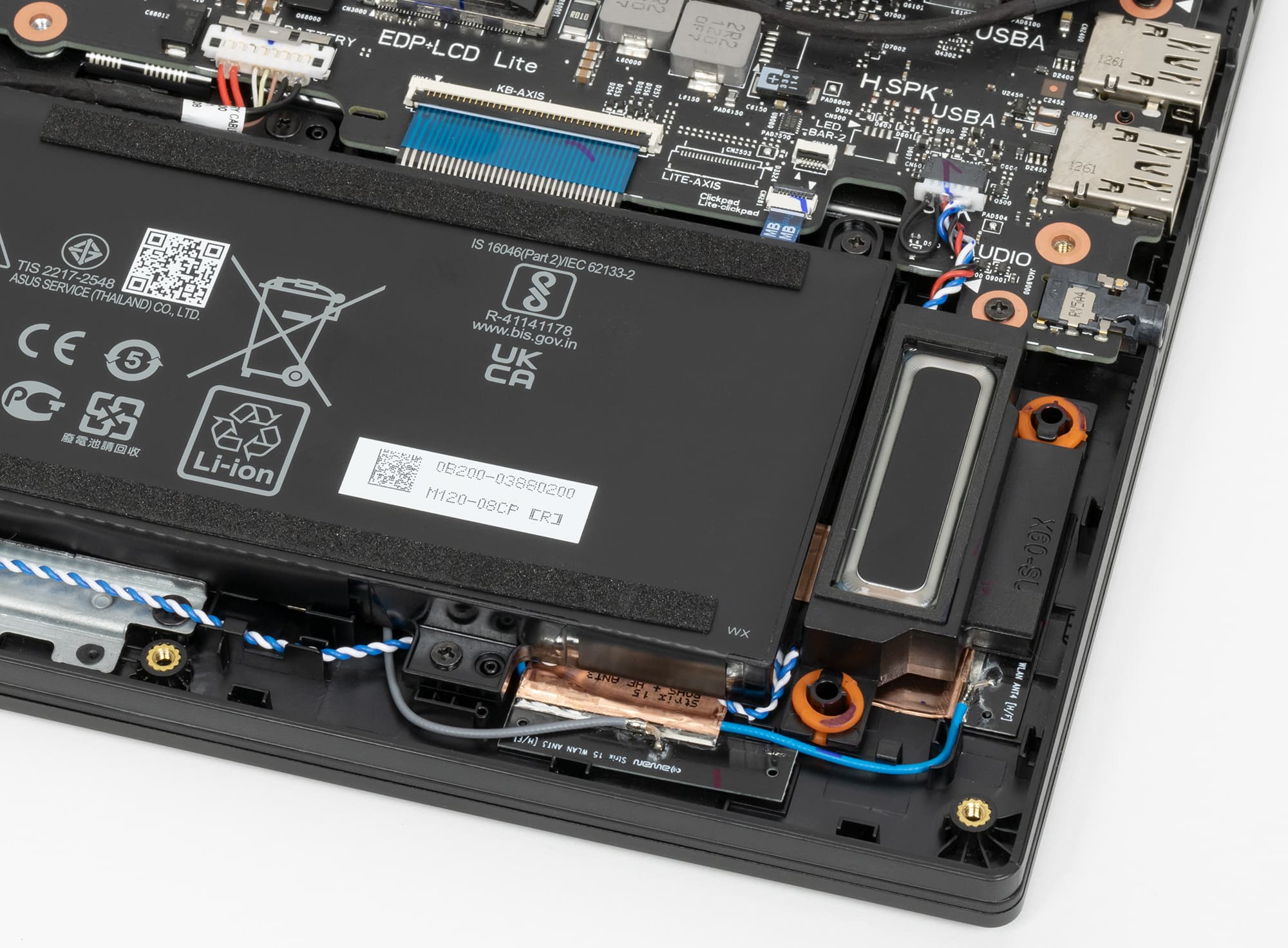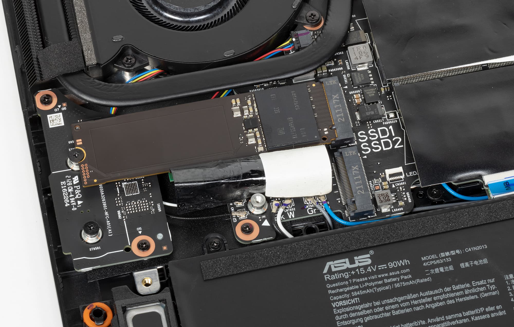 Сняв нижнюю крышку, получаем доступ к основным компонентам аппаратной начинки. Пользователь может изменить качественное и количественное наполнение слотов ОЗУ и M.2, а равно и заменить батарею. Последняя, разумеется, крепится к корпусу винтами, но извлекается и устанавливается без особых хлопот.