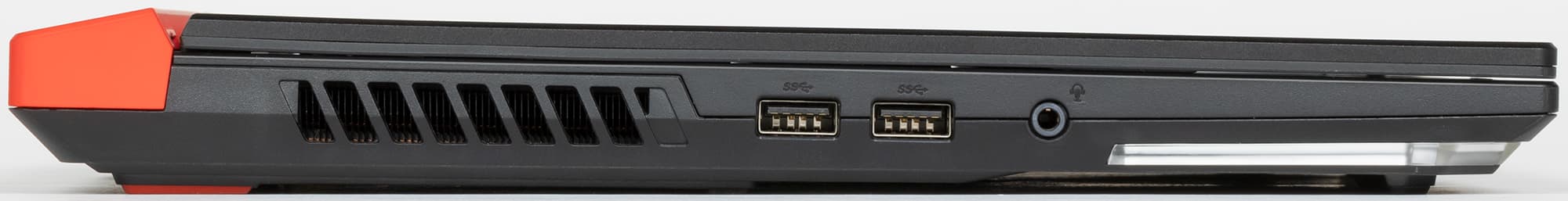 На левой боковой панели помещена решетка выходного отверстия системы охлаждения, затем два разъема USB Type A, стандартный миниджек 3,5 мм для подключения наушников или аудиогарнитуры, а также световод подсветки.
