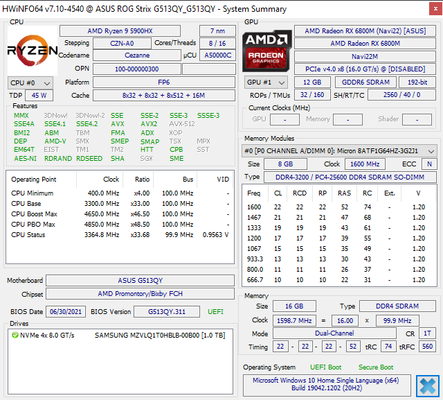 Asus ROG Strix G15 Advantage Edition G513QY — игровой портативный ПК, примечательный своей аппаратной конфигурацией. Оба вычислителя системы, то есть центральный процессор и дискретная видеокарта, производятся одним и тем же изготовителем, а таковым может быть только AMD. Эта компания 5 мая 2021 г. выпустила новую линейку своих дискретных мобильных видеоускорителей, среди которых AMD Radeon RX 6800M, установленный в герое нашего обзора, является несомненным лидером. Помимо топовой видеокарты с 12 ГБ видеопамяти, в Asus ROG Strix G15 Advantage Edition G513QY установлен также топовый процессор AMD Ryzen 9 5900HX, 16 ГБ ОЗУ, SSD-накопитель 1 ТБ и полный набор необходимых проводных и беспроводных интерфейсов, включая Gigabit Ethernet, Wi-Fi 6, три порта USB3 Gen2.
