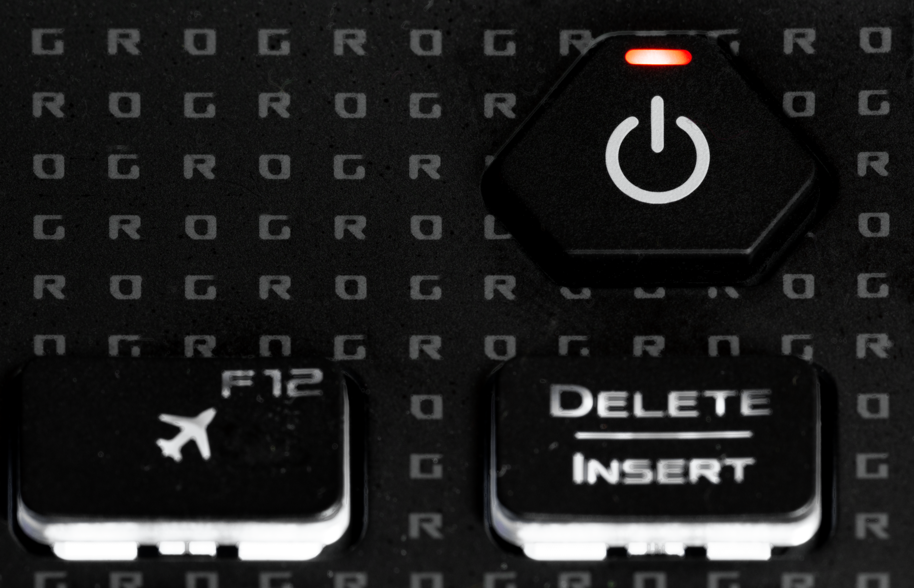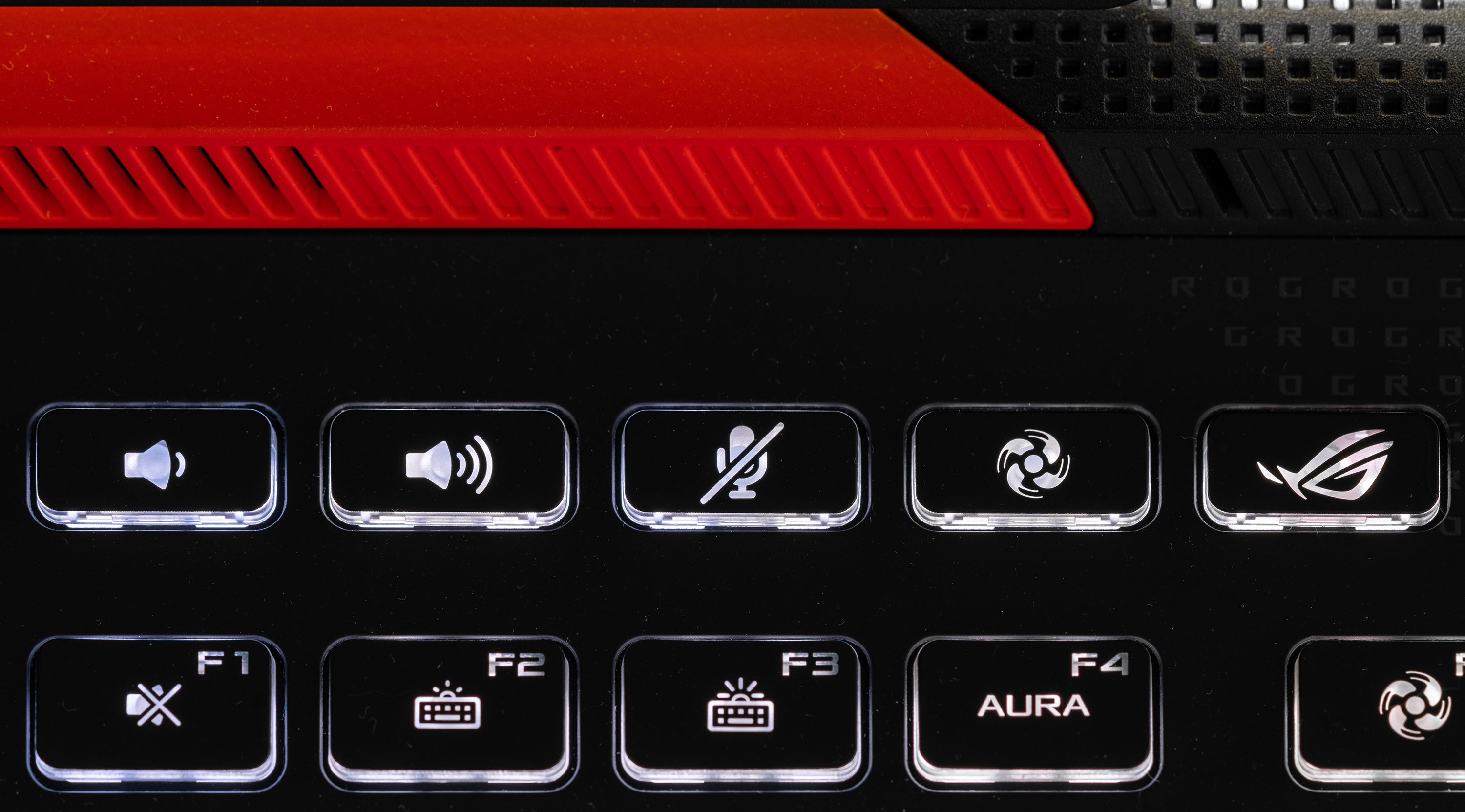 Поверх всех расположен ряд из пяти настроечных кнопок: уменьшить звук, увеличить звук, включить и выключить встроенный микрофон, изменить текущий профиль производительности (Silent—Performance—Turbo), запустить приложение Armoury Crate. Последние элементы специфичны для ноутбуков Asus ROG и не имеют аналогов в стандартной десктопной раскладке.
