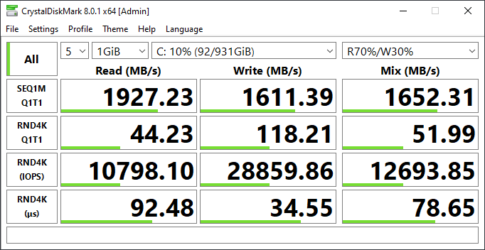 В первом из них установлено NVMe-хранилище Samsung MZ-VLQ1T0B неформатированной емкостью 1 ТБ. В рабочей конфигурации со служебными разделами доступное пространство уменьшается до 930 ГБ, а после развертывания Windows 10 и стандартного набора приложений остается 880 ГБ. Второй разъем равноценен первому, поэтому в оба можно установить одинаковые устройства и организовать массивы RAID0 (объединения с двухкратным выигрышем в скорости чтения и записи) либо RAID1 (зеркалирование для повышения надежности хранения данных).
