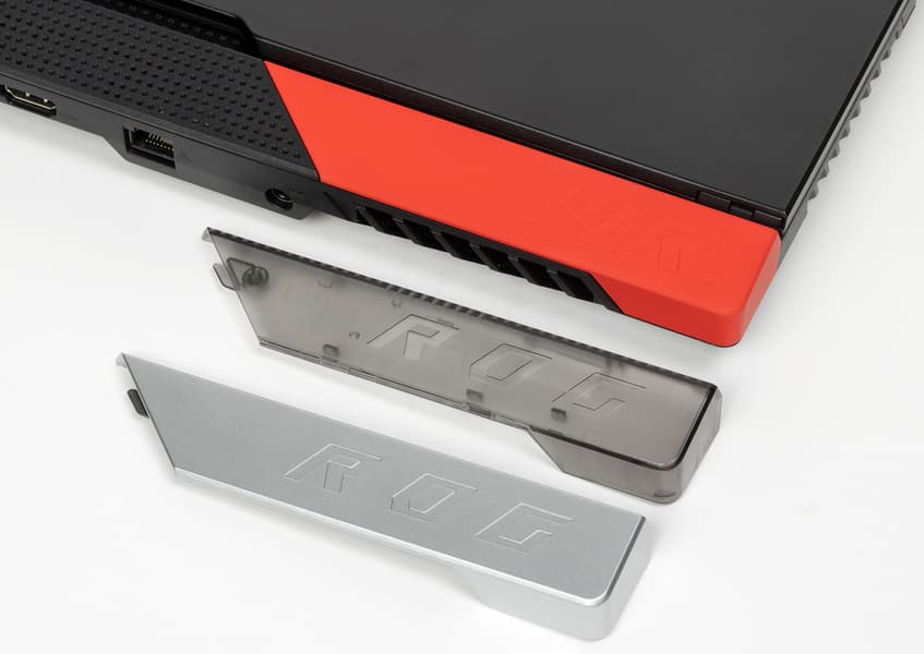 Штатная накладка на угол корпуса — родовой признак ноутбуков ROG. Как мы писали выше, у нашего героя она красного цвета — это намек на то, что оба вычислителя системы (CPU и GPU) изготовлены одним производителем, AMD. А для ненавистников всего красного в комплекте поставки обнаруживаются еще две сменные накладки, совершенно нейтральные по колористике.