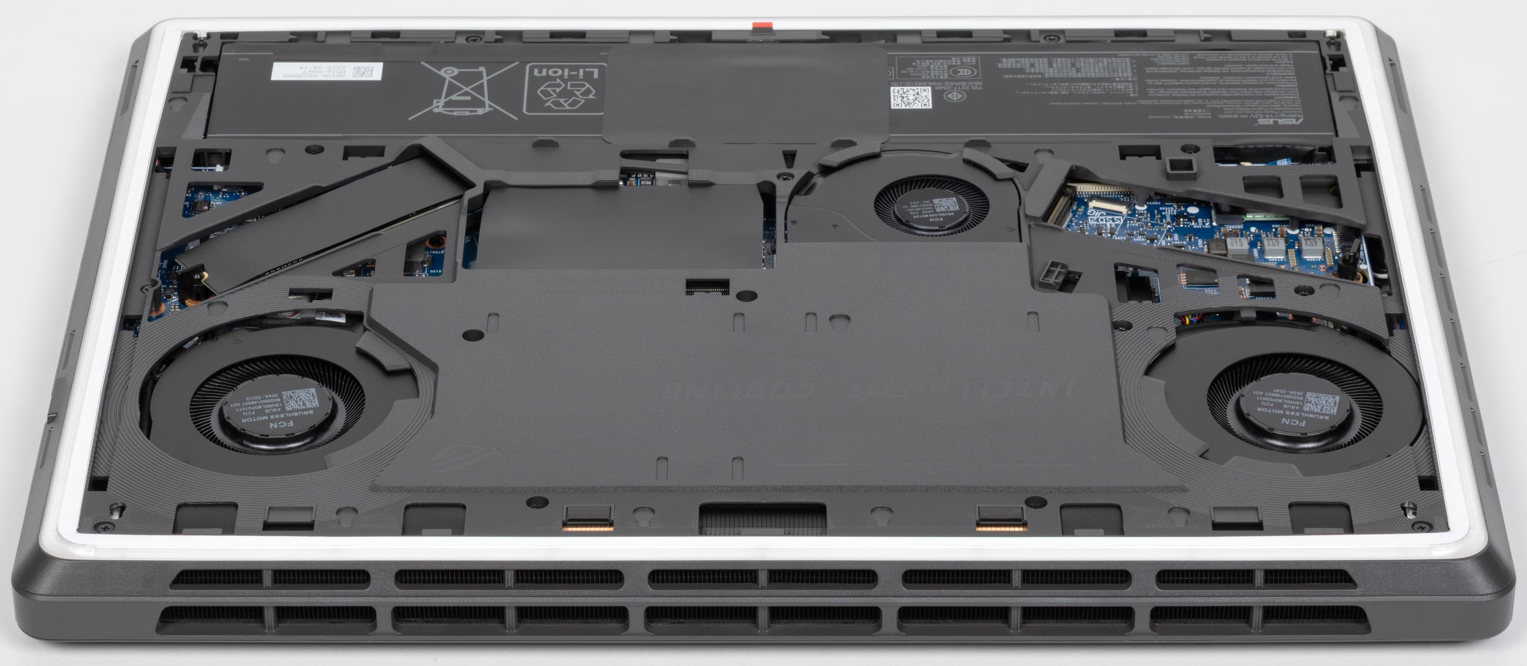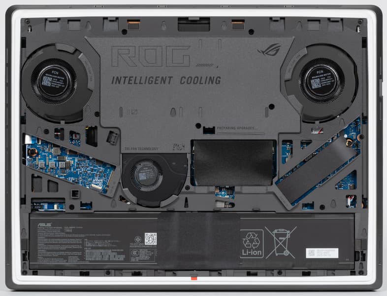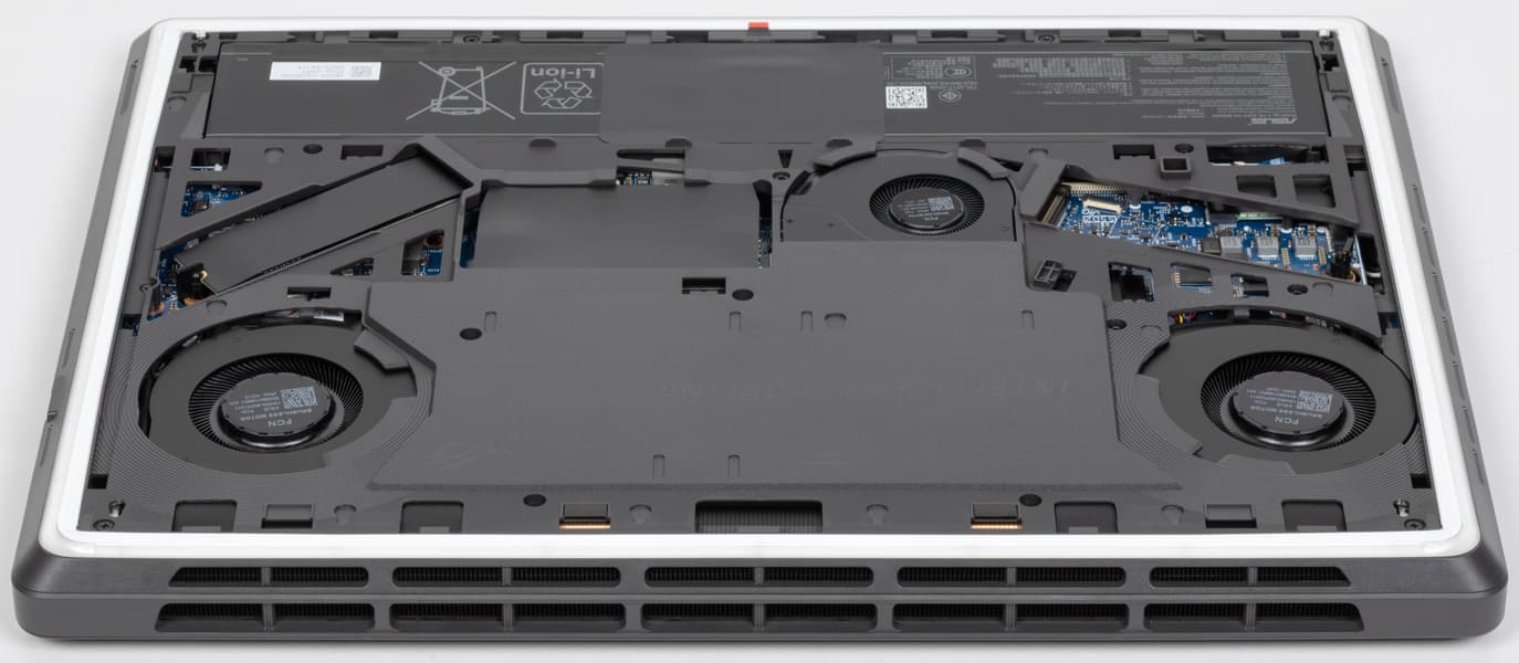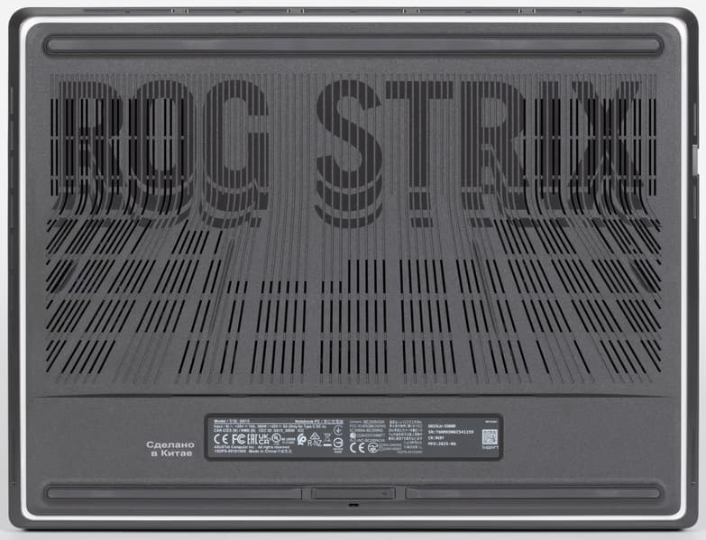Все внутренности Asus ROG Strix G16 (2025) G615LW дополнительно защищены специальной накладкой. В ней имеются прорези для кулеров CPU, GPU и «системного» (Asus Tri-Fan Technology), а также окна для доступа к аккумулятору, модулями оперативной памяти (под изолирующей шторкой), системному накопителю, второму (свободному) слоту M.2 для установки дополнительного NVMe SSD.