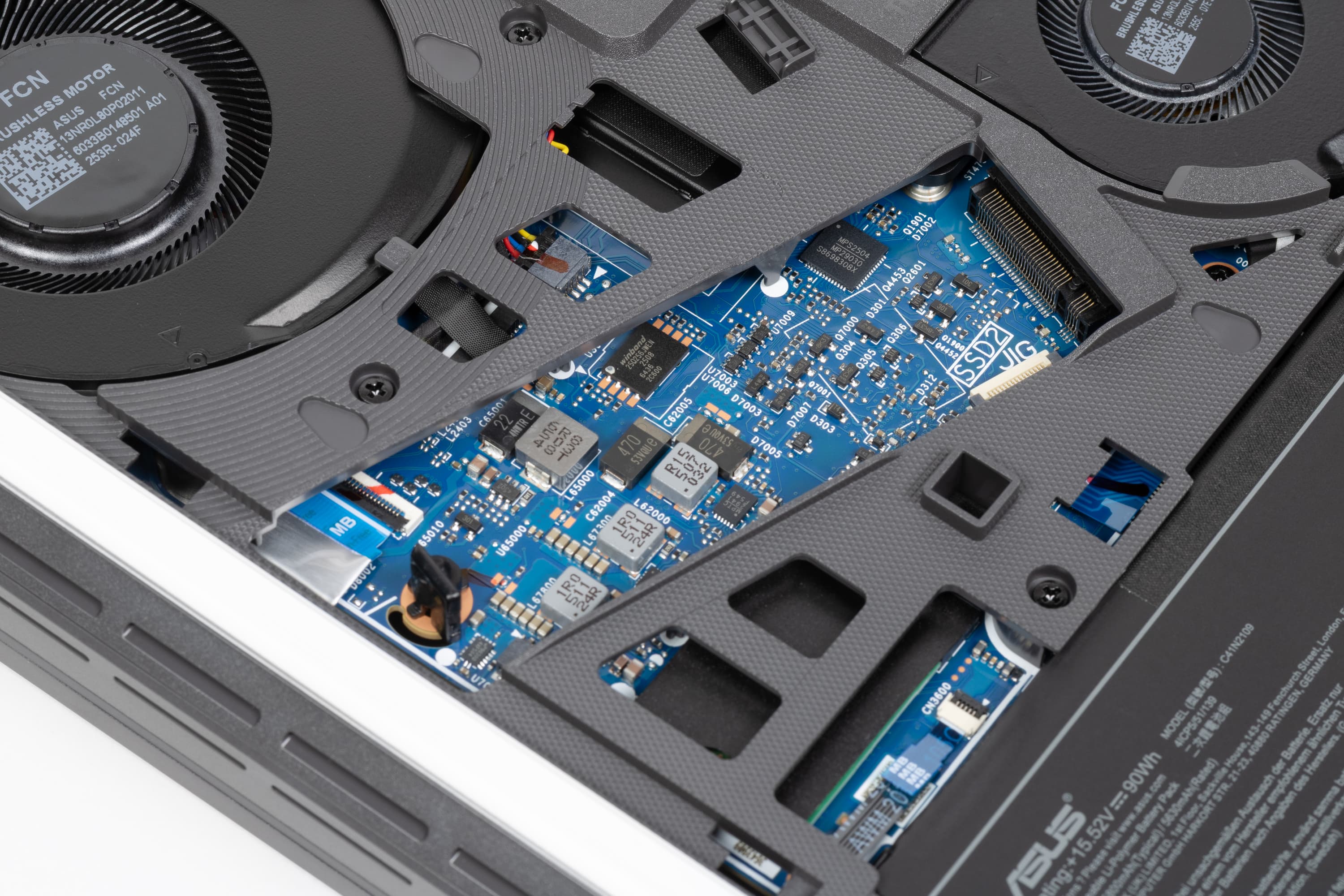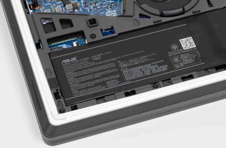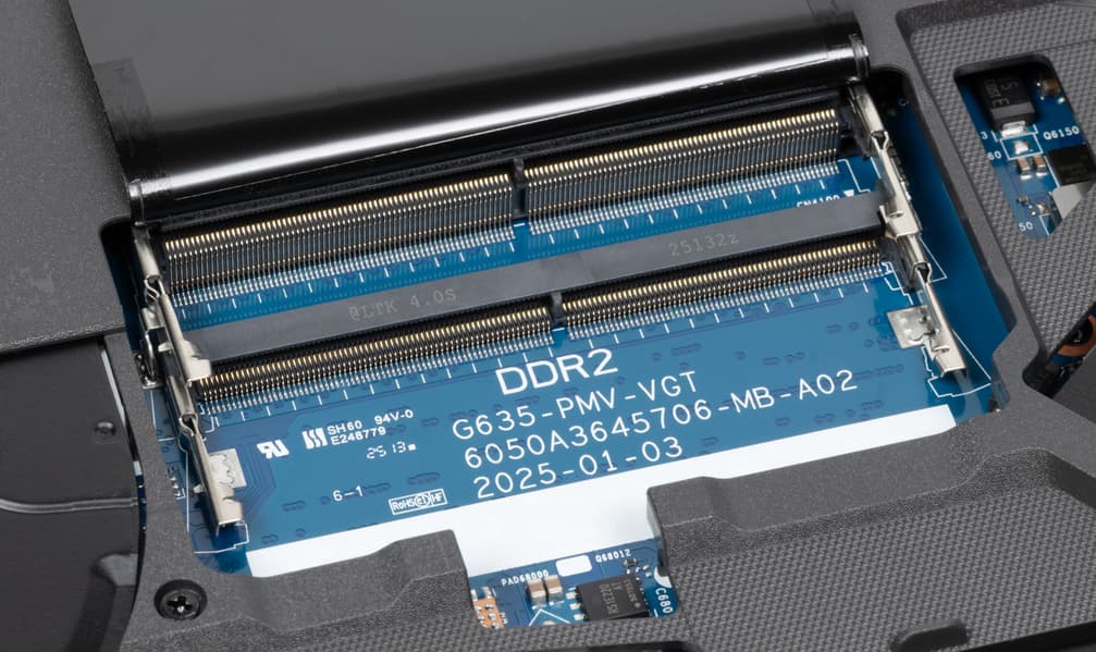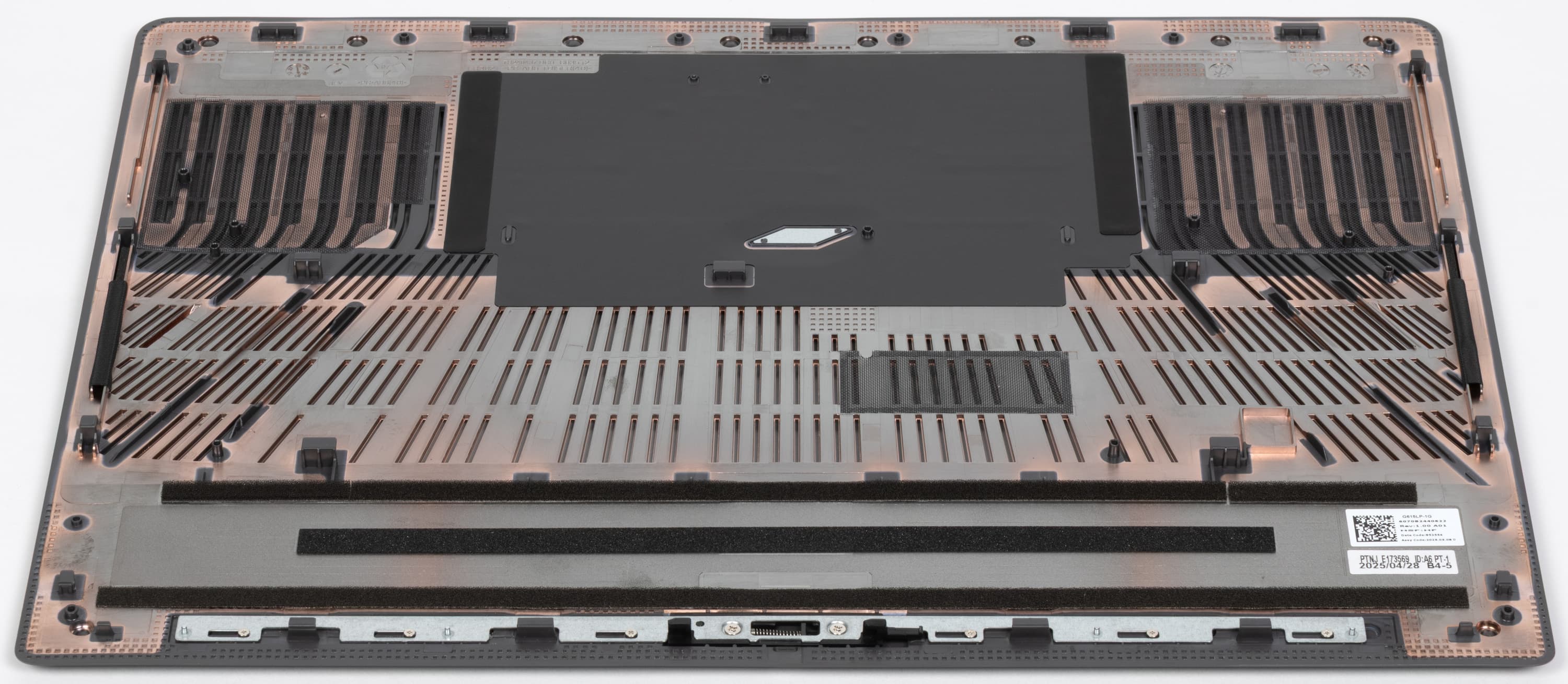 Все внутренности Asus ROG Strix G16 (2025) G615LW дополнительно защищены специальной накладкой. В ней имеются прорези для кулеров CPU, GPU и «системного» (Asus Tri-Fan Technology), а также окна для доступа к аккумулятору, модулями оперативной памяти (под изолирующей шторкой), системному накопителю, второму (свободному) слоту M.2 для установки дополнительного NVMe SSD.