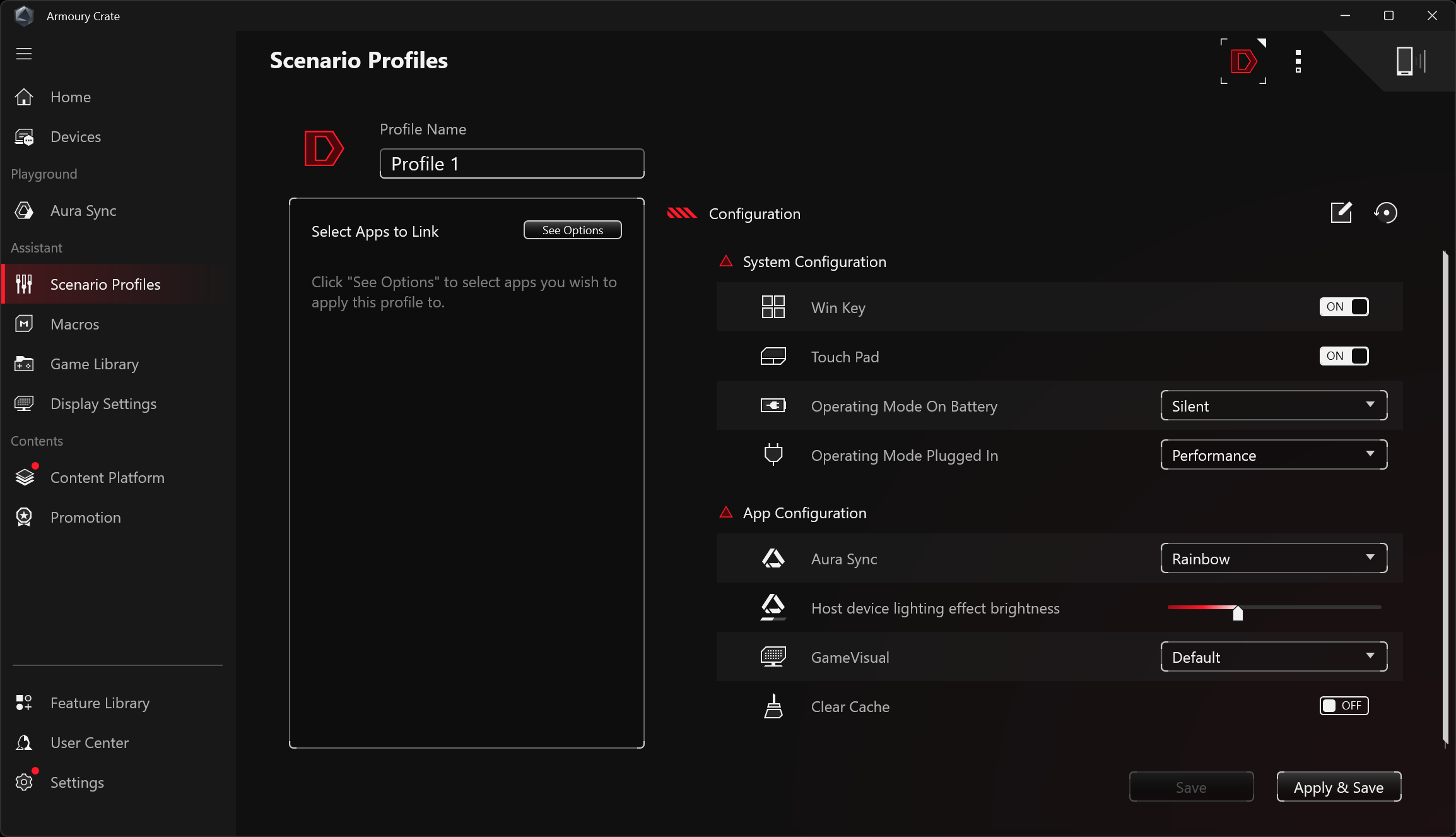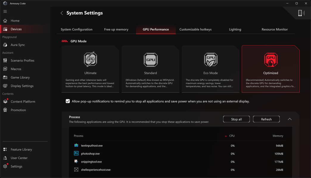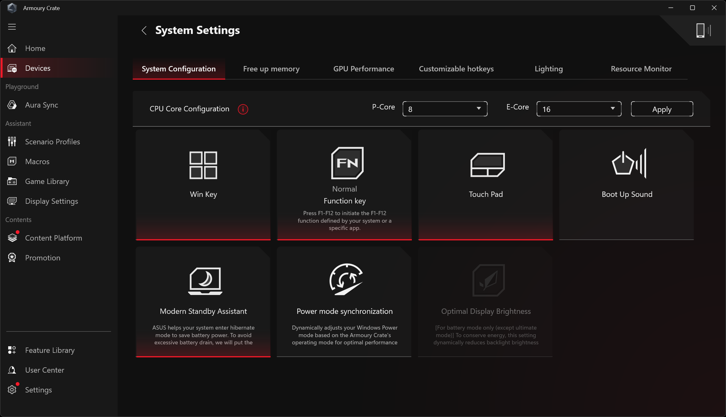В разделе Devices получаем доступ к подменю установок системы. Его первая позиция — System Configuration (Конфигурация системы). Здесь можно определить судьбу клавиши Windows, поведение регистра Fn, кликпада, аудио. Имеются также Modern Standby Assistant (ассистент по отключению компонентов системы в режиме сна), Power Mode Synchronization (синхронизация режима питания), установки HDR и управление подсветкой клавиатуры (Backlight Control).