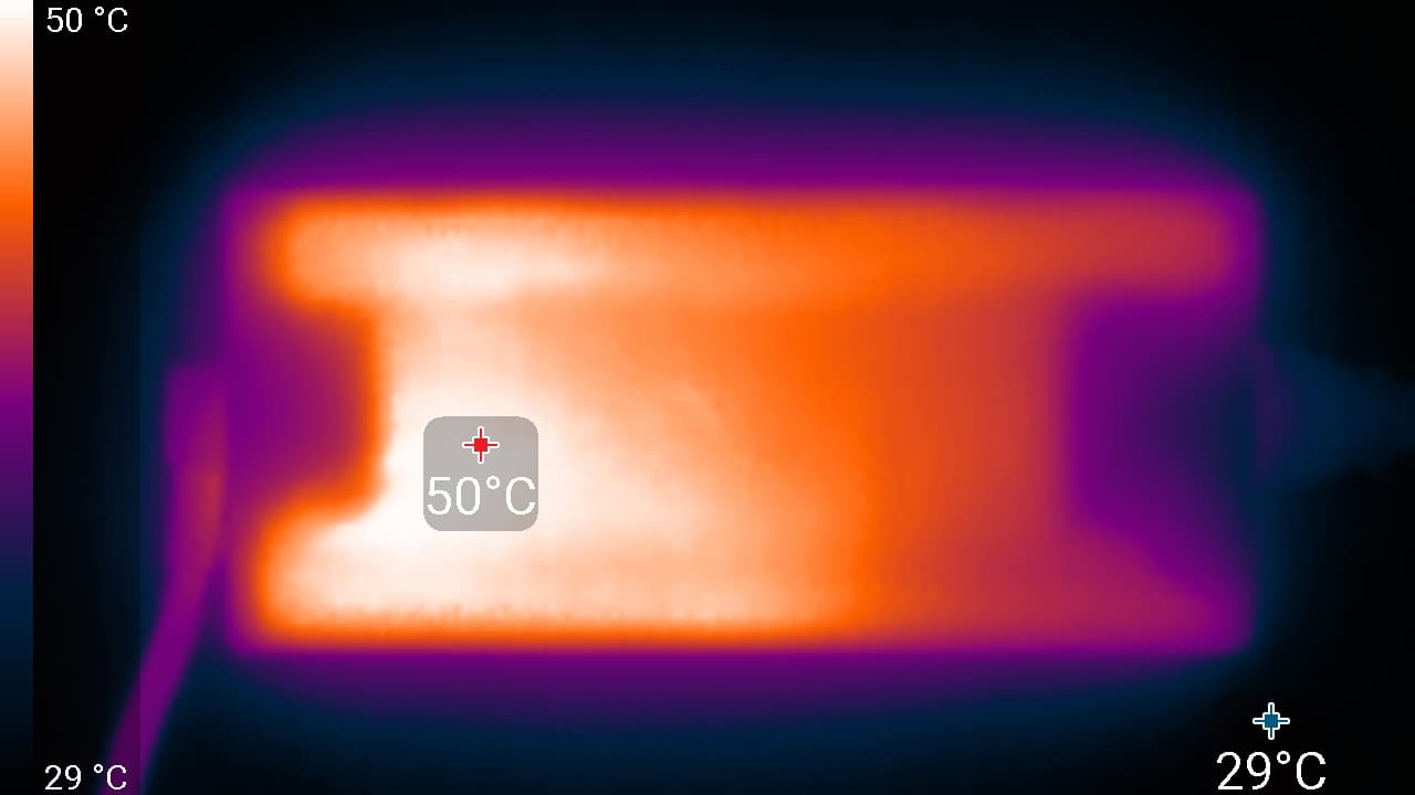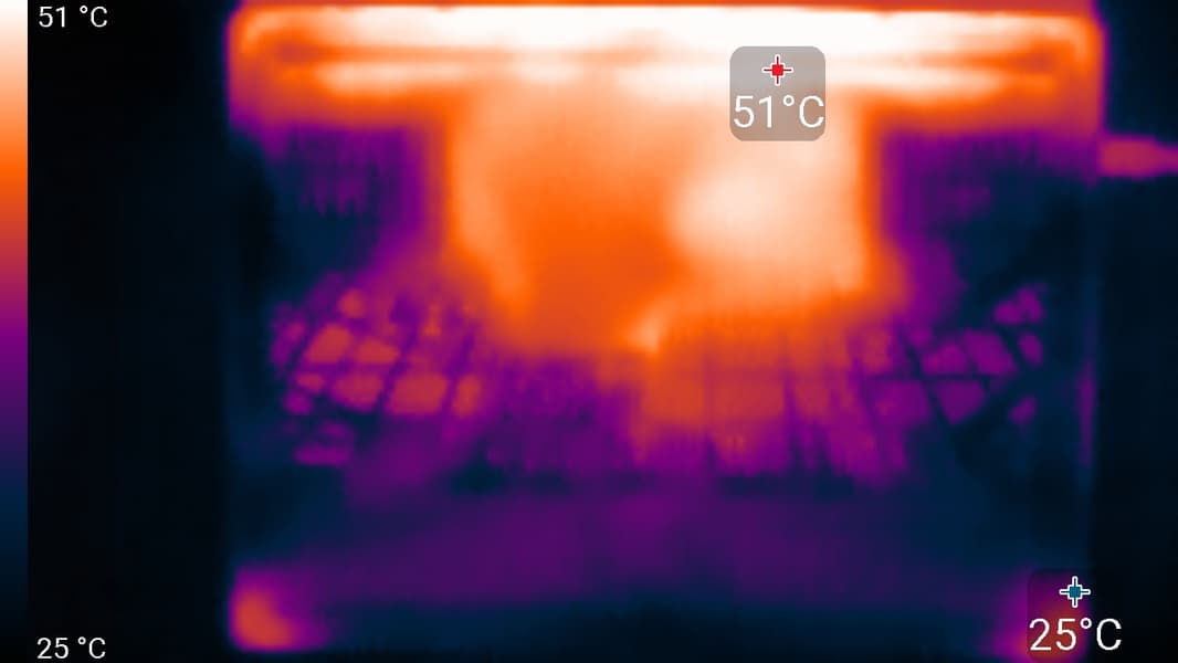 Задняя панель занята решеткой с крупными ячейками, через которую изнутри наружу выбрасывается нагретый воздух.