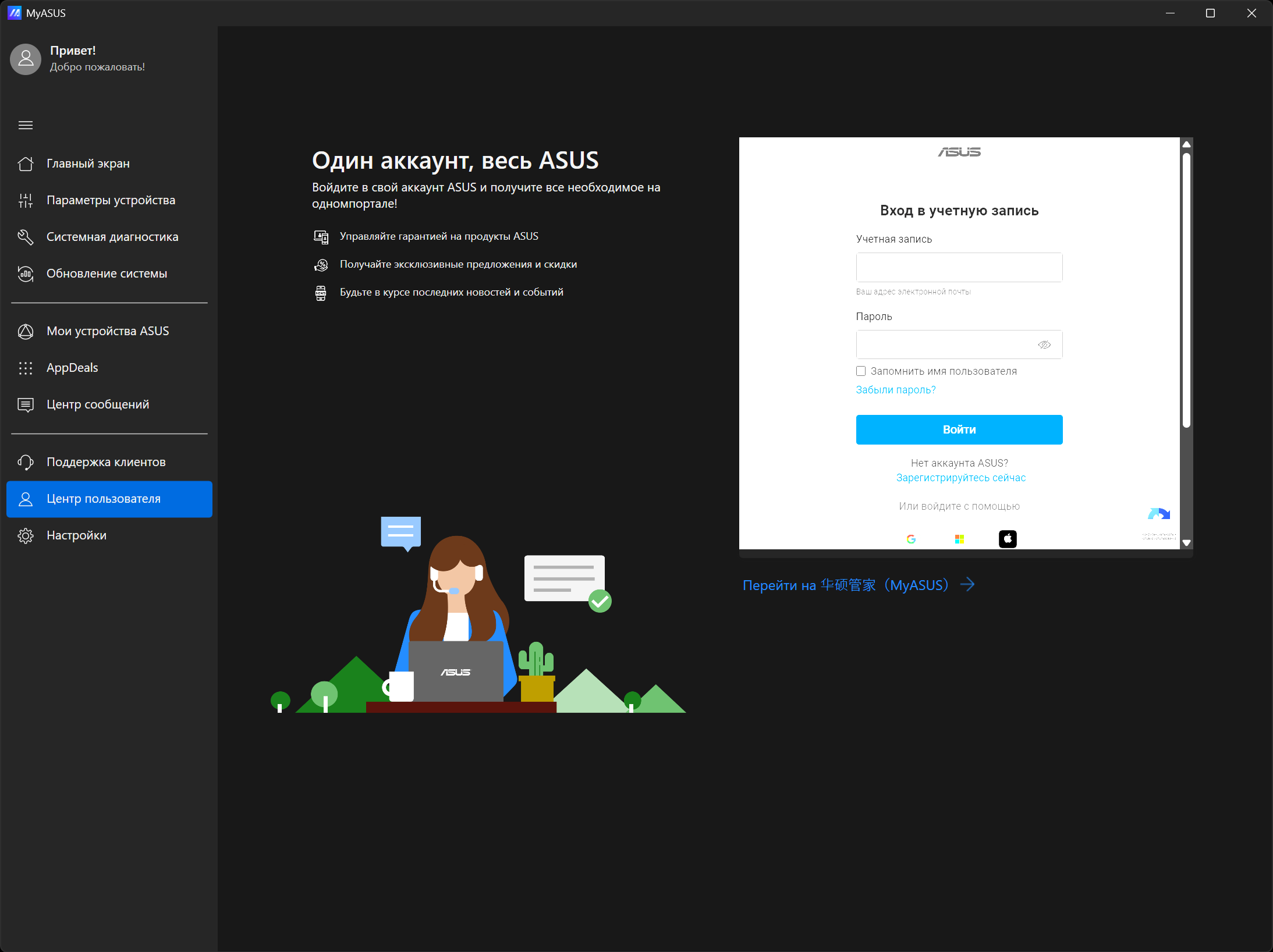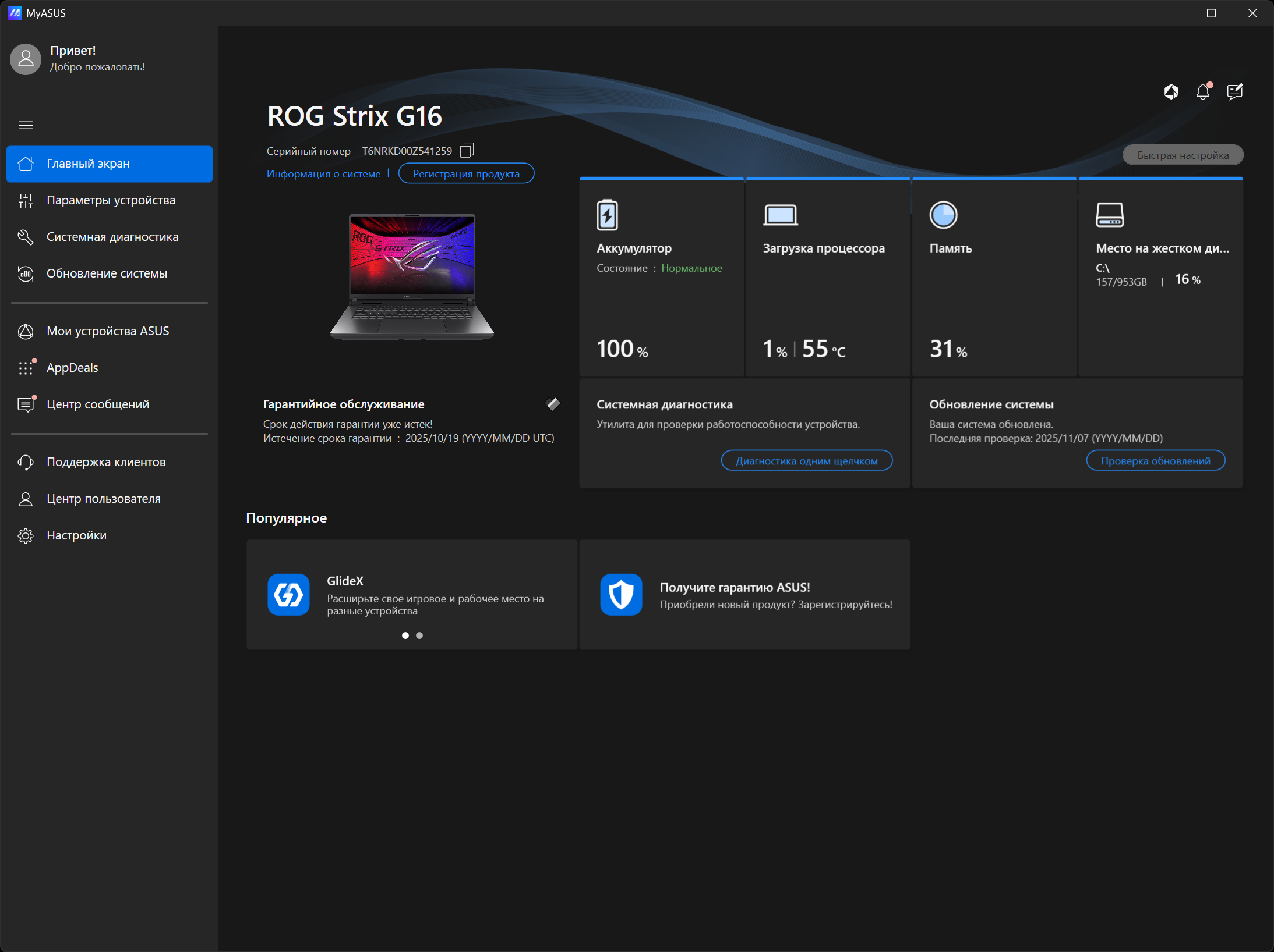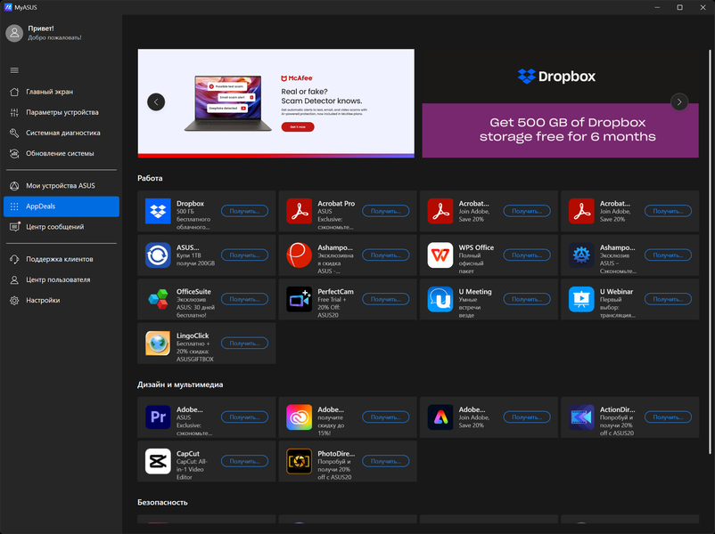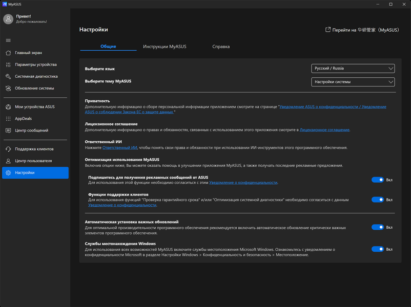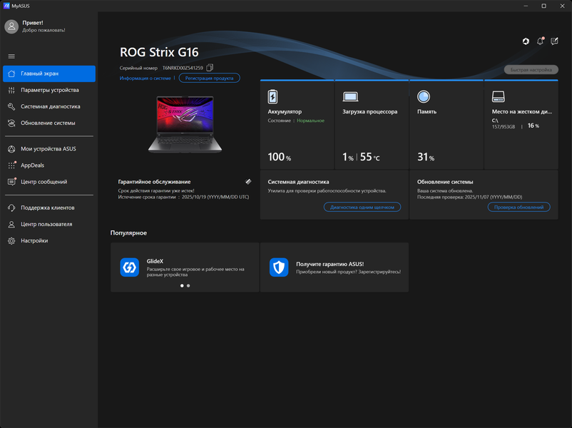 ROG Strix G615LW прибыл к нам с установленной ОС Windows 11, триал-версией Microsoft Office 365, сетап-инициатором Яндекс, пакетом МойОфис, и фирменными утилитами Armour Crate и MyAsus.