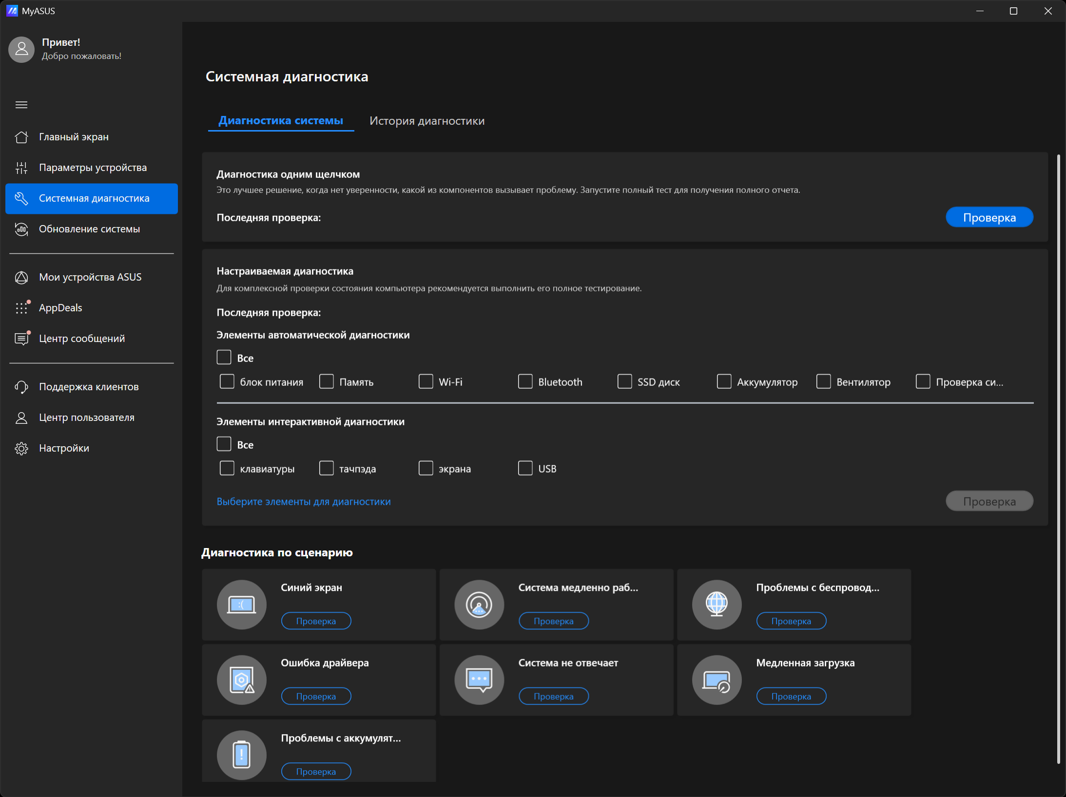 На главной странице (Home в меню слева) доступен выбор сценариев (пресетов, профилей). Об этом мы подробнее расскажем в разделе о работе под нагрузкой.