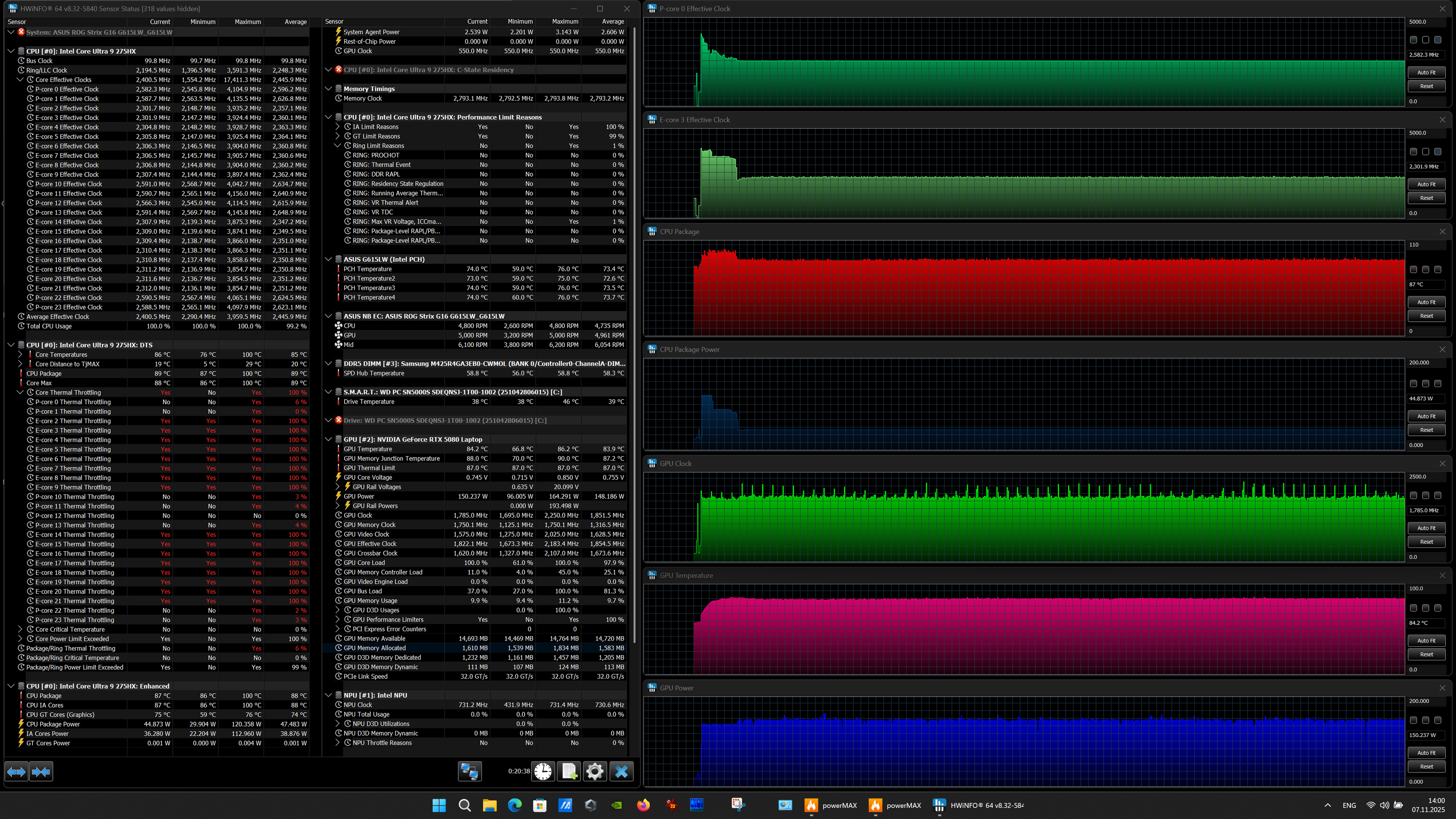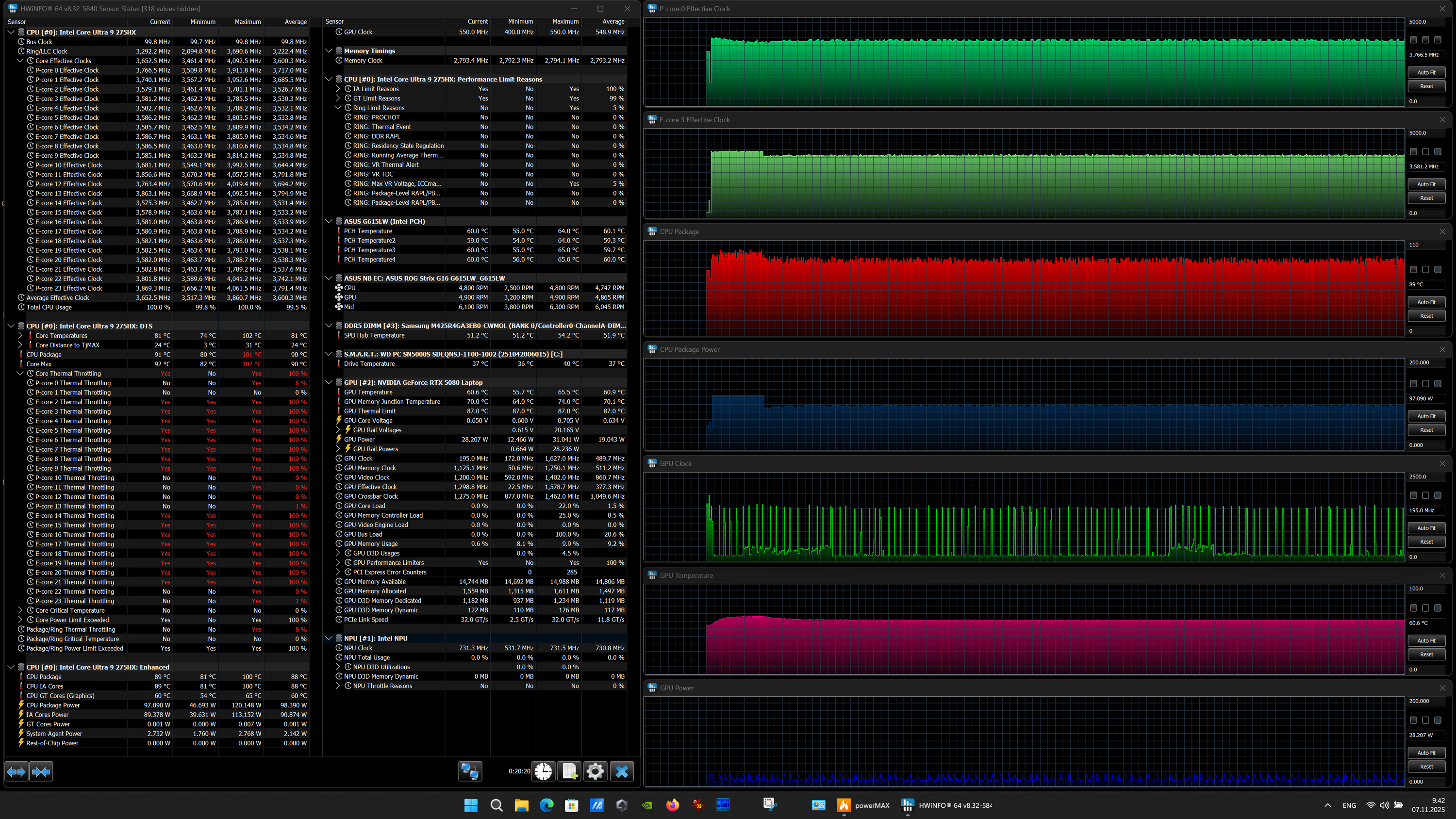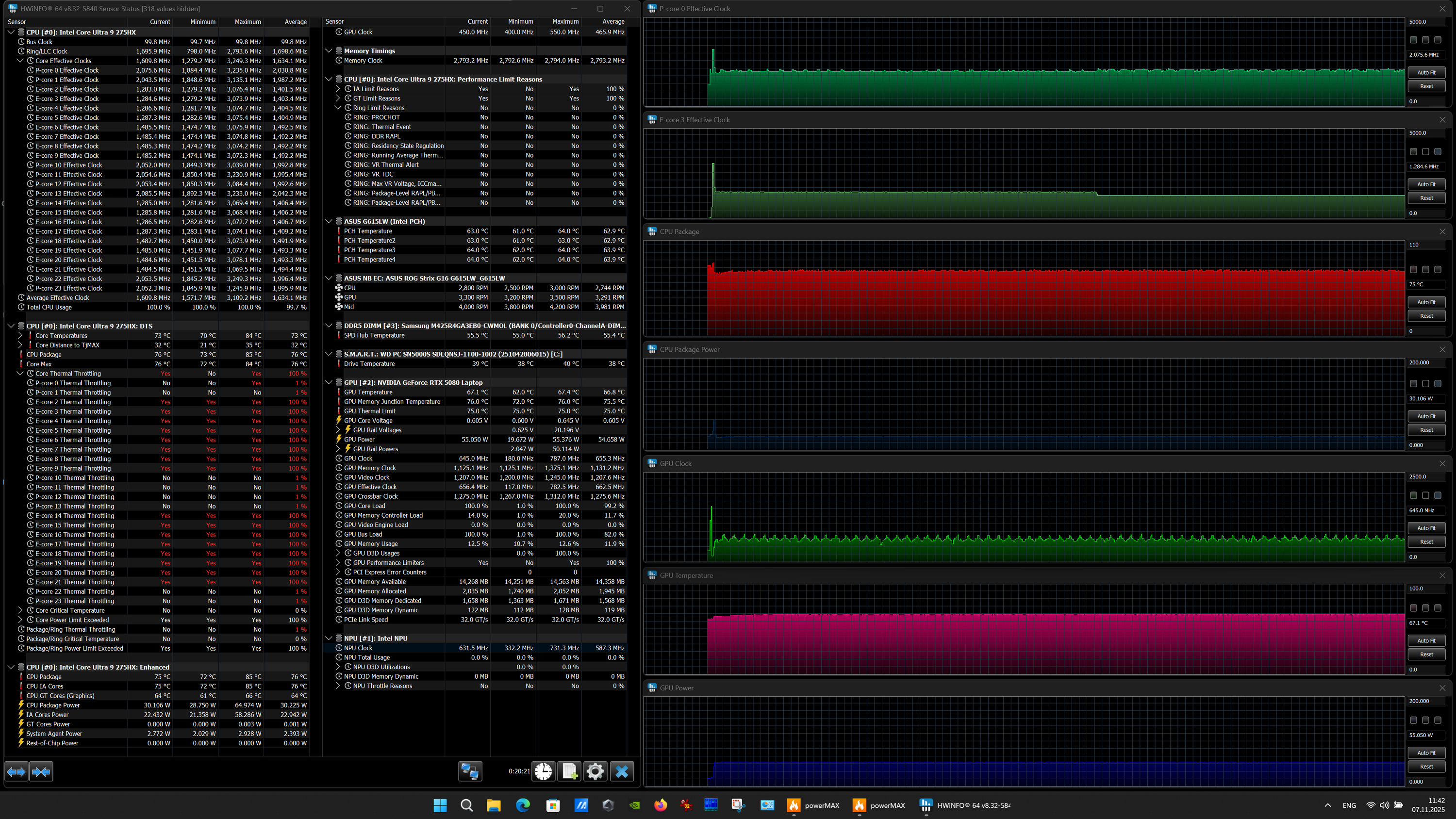 | Процессор | Intel Core Ultra 9 275HX: 8 P-ядер, 2,7/5,4 ГГц; 16 E-ядер; 2,1/4,6 ГГц; TDP 45—55/160 Вт, Tjmax 105 °C; Intel AI Boost NPU 13 TOPS | |