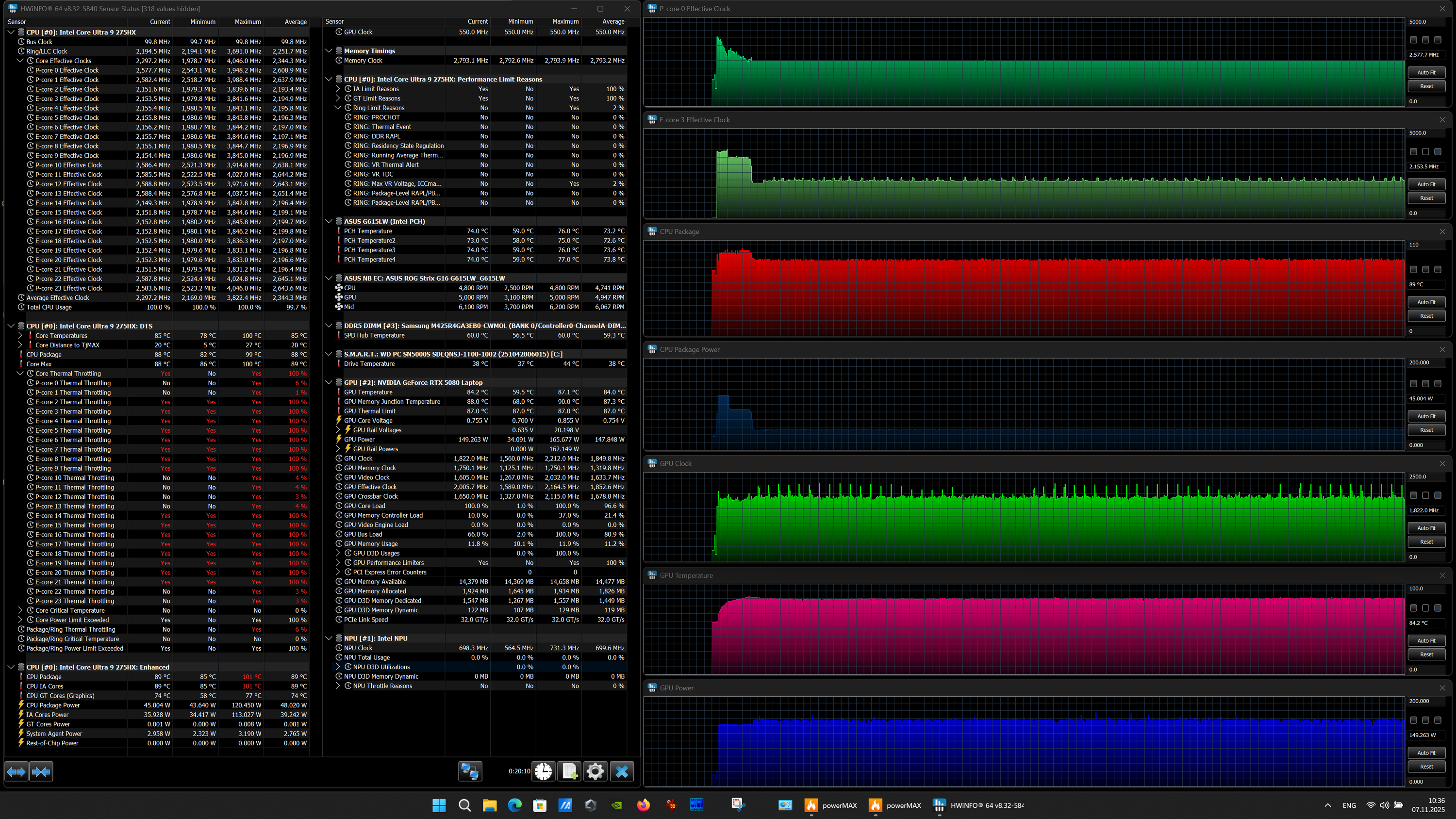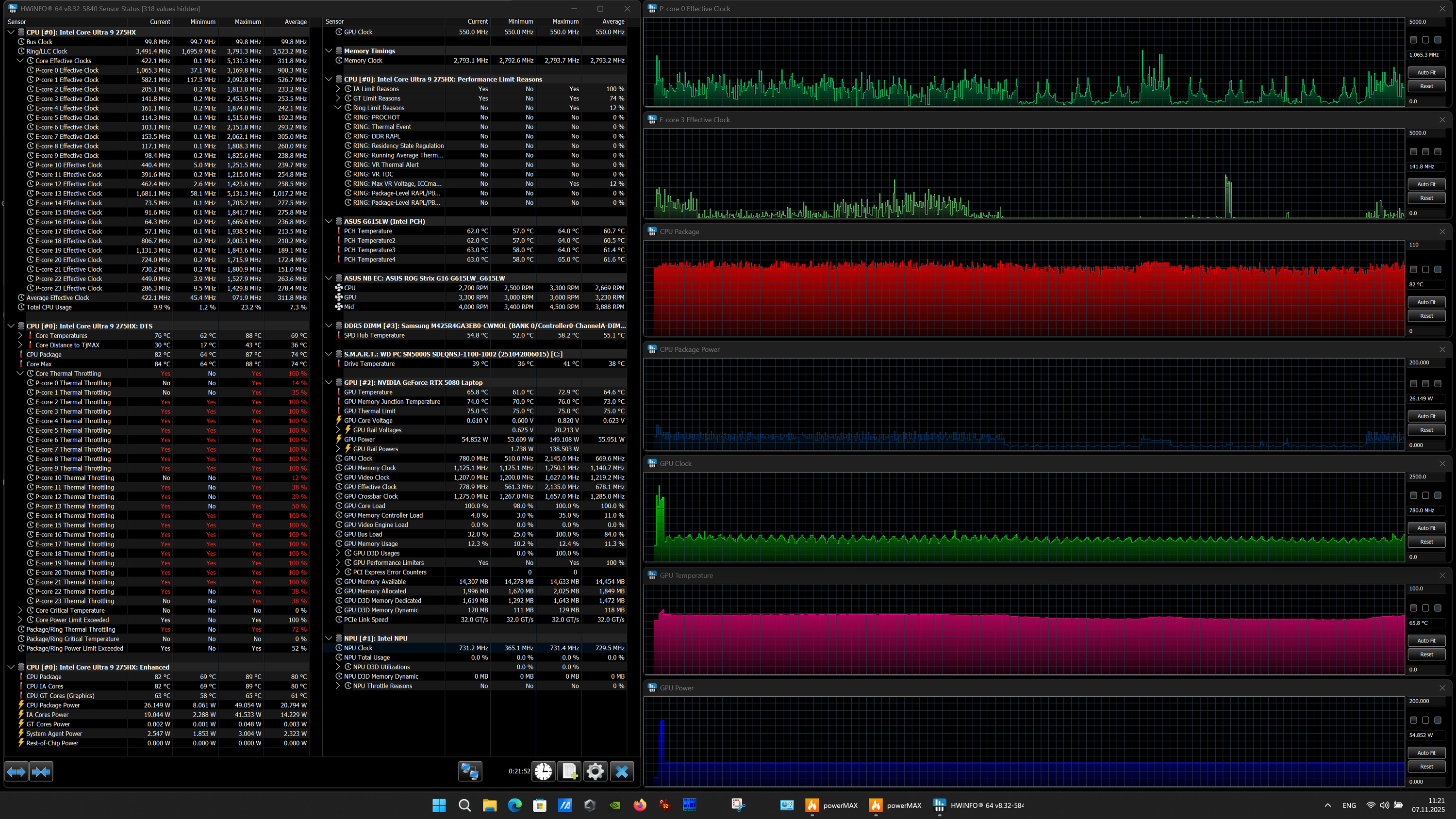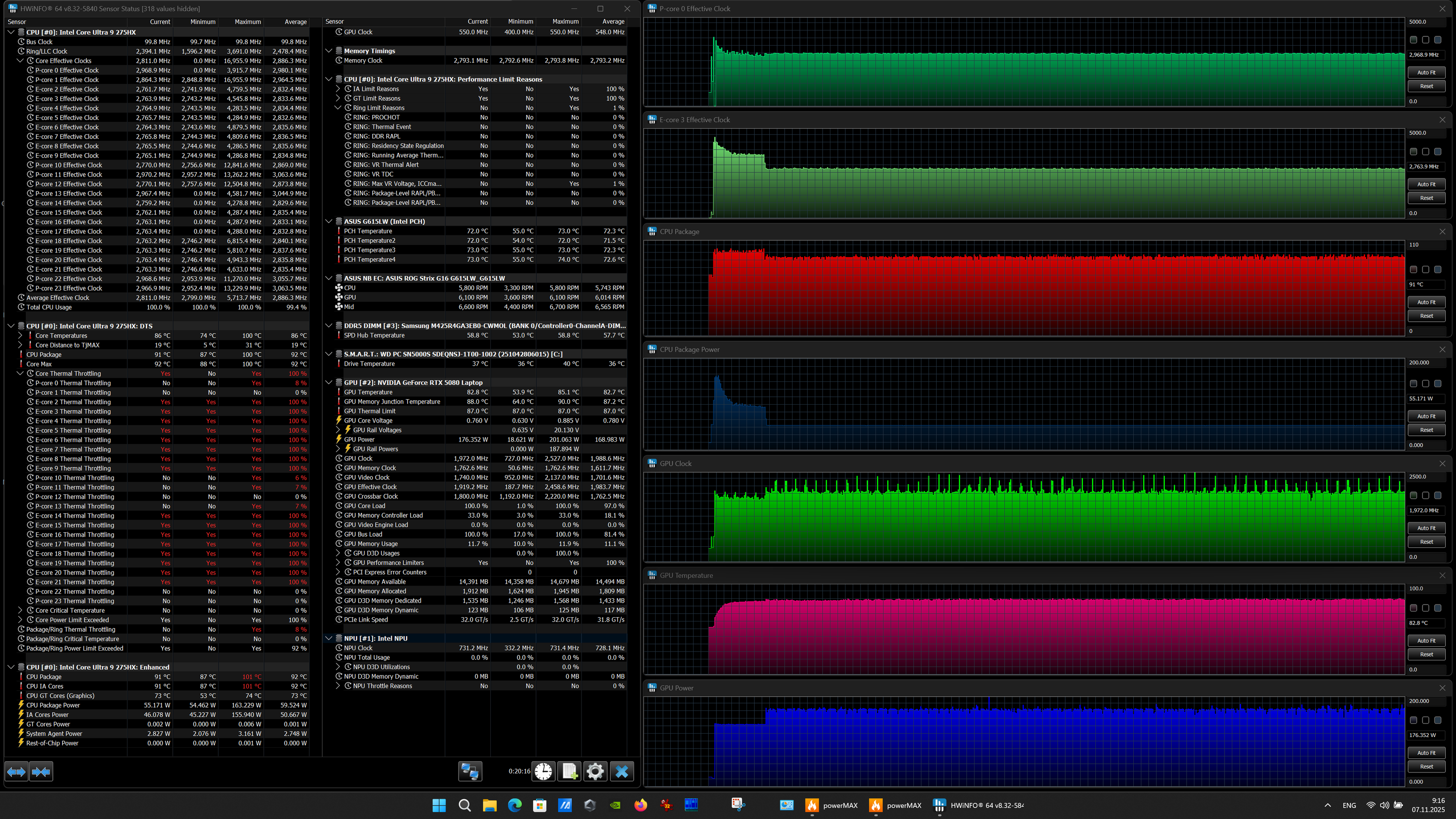 | Процессор | Intel Core Ultra 9 275HX: 8 P-ядер, 2,7/5,4 ГГц; 16 E-ядер; 2,1/4,6 ГГц; TDP 45—55/160 Вт, Tjmax 105 °C; Intel AI Boost NPU 13 TOPS | |