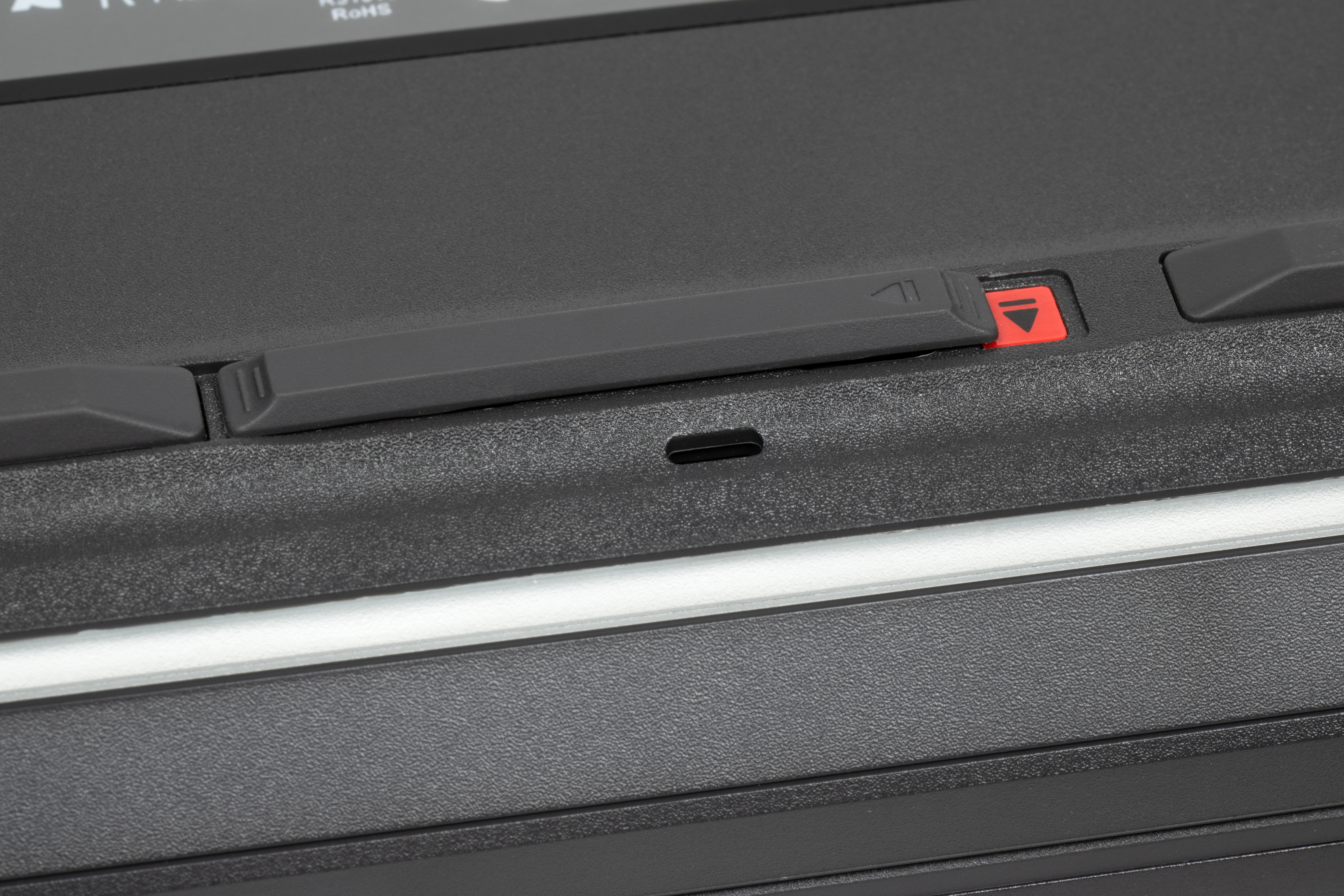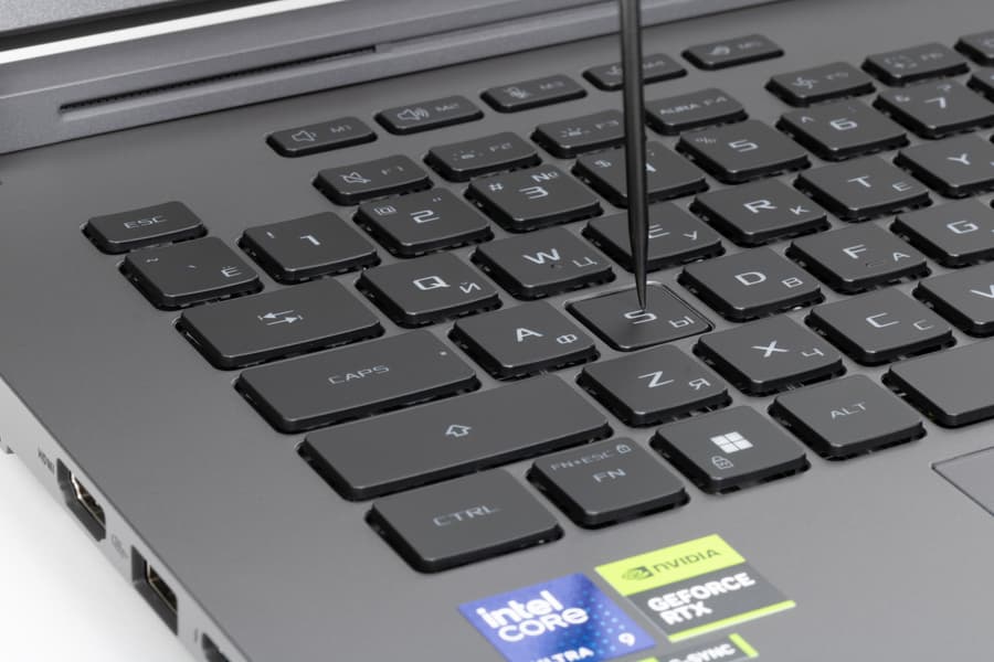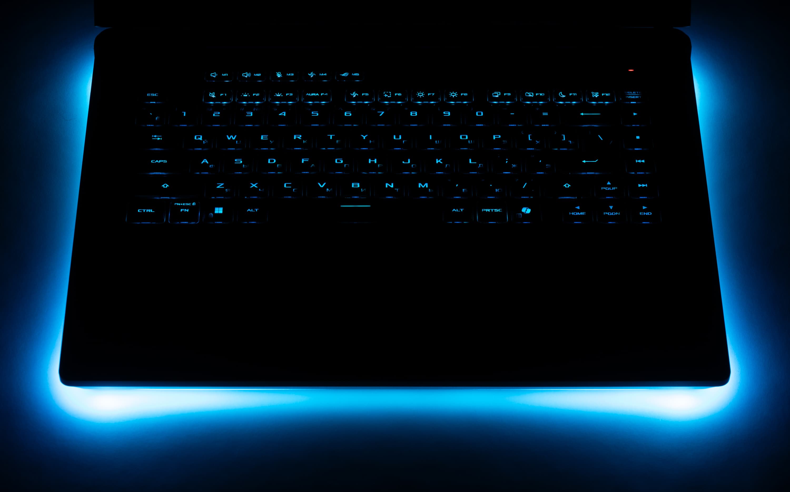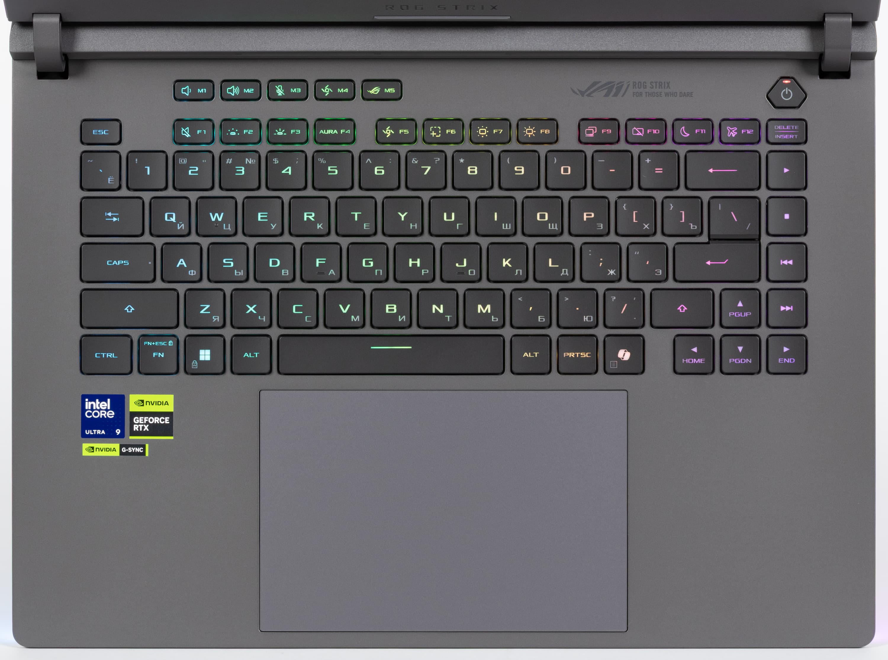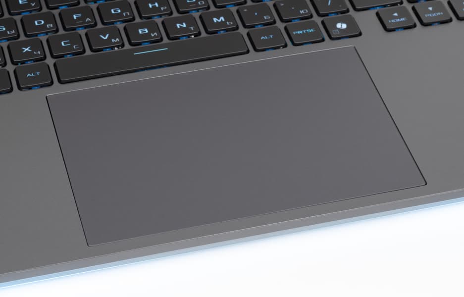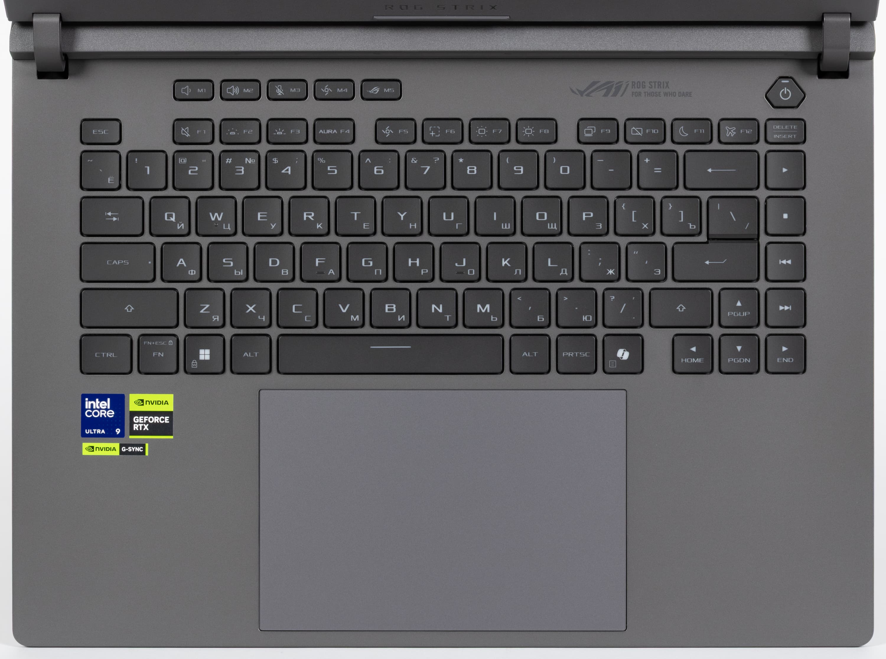 Лицевая панель, как и у других моделей серии ROG, довольно маркая, легко воспринимающая на себя отпечатки пальцев. Удалить их без помощи чистящих средств достаточно сложно. Пользователю предлагается клавиатура мембранного типа, по раскладке и функциональности заметно уступающая стандартной десктопной конфигурации из-за отсутствия цифрового блока.