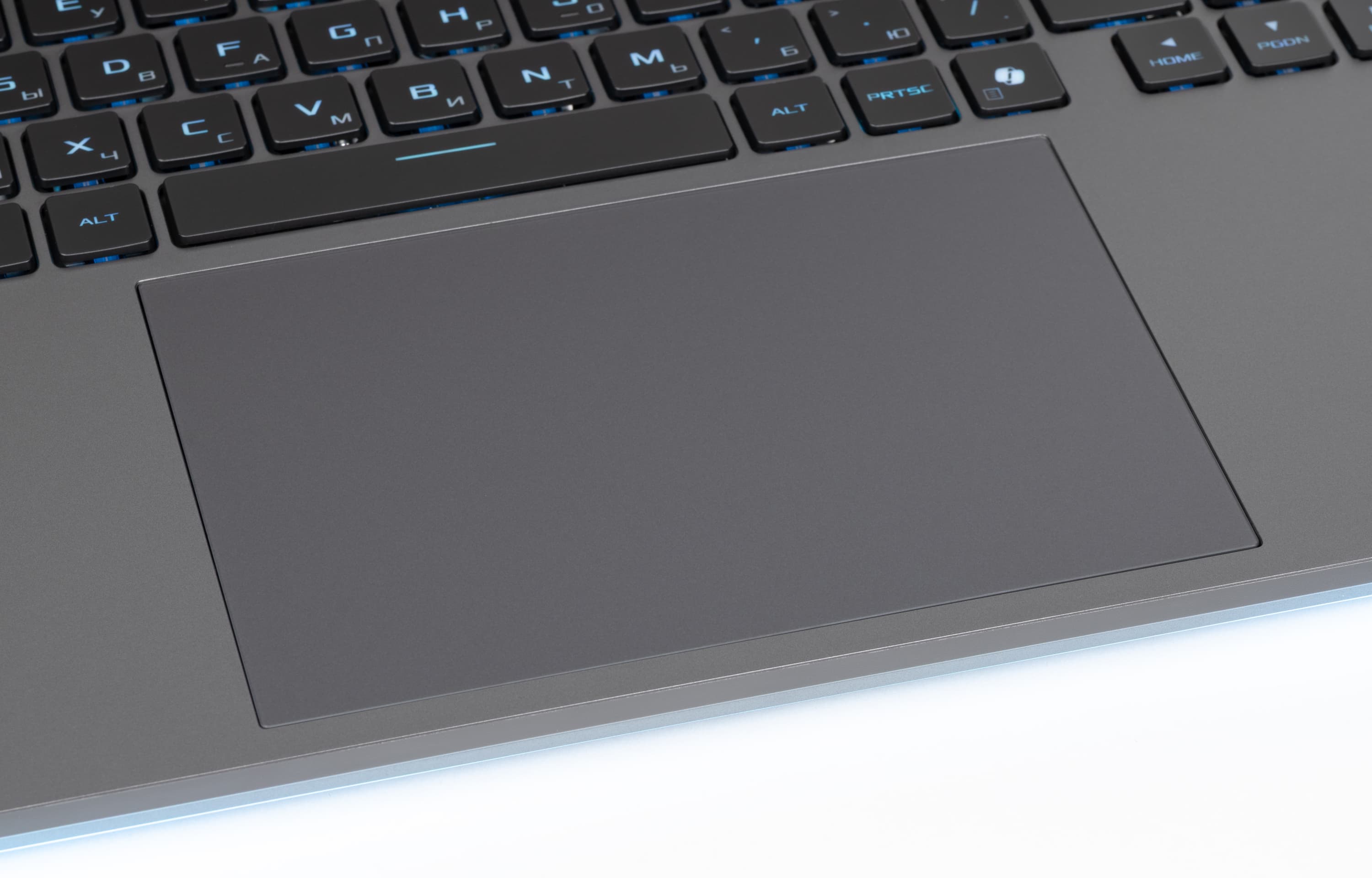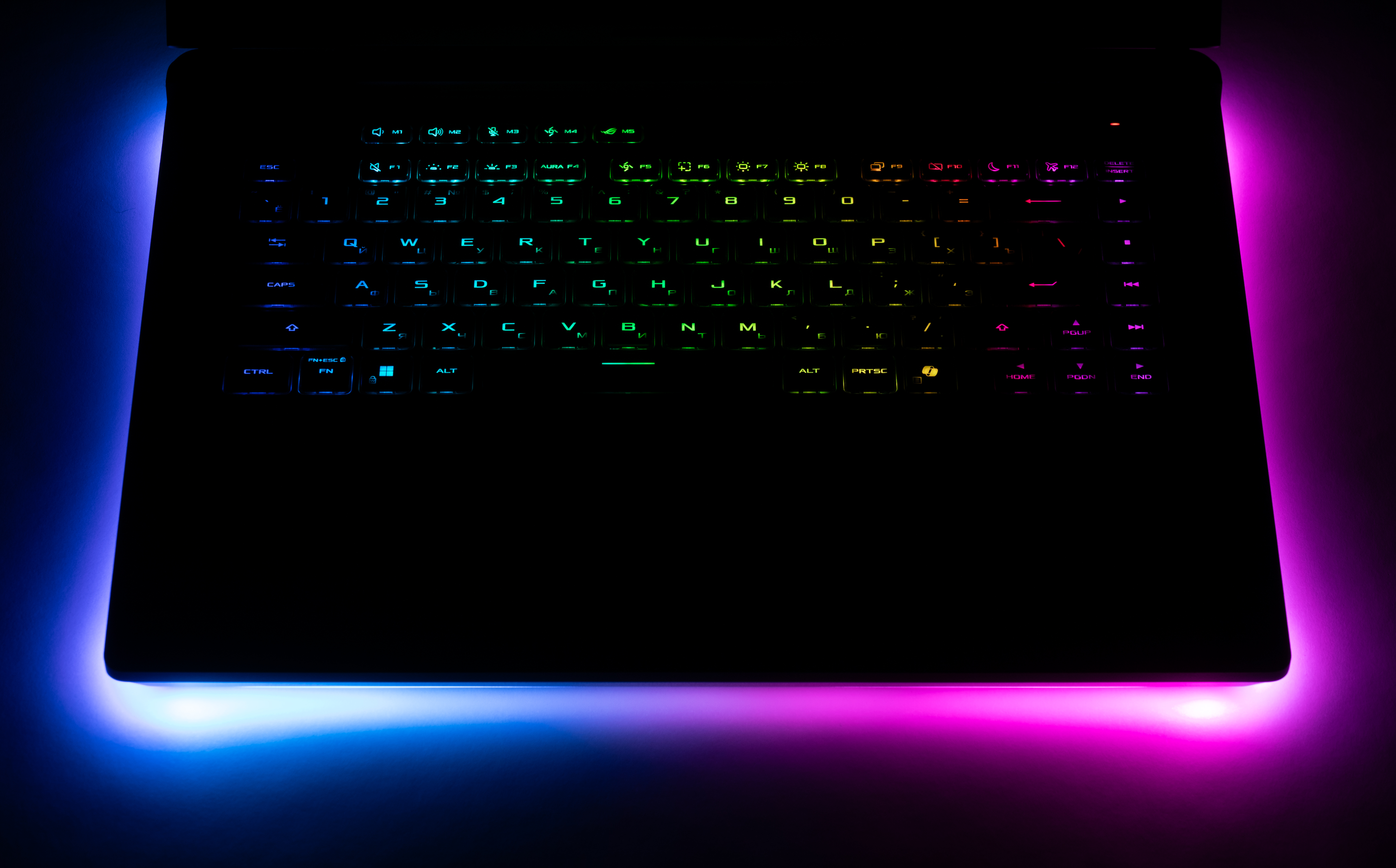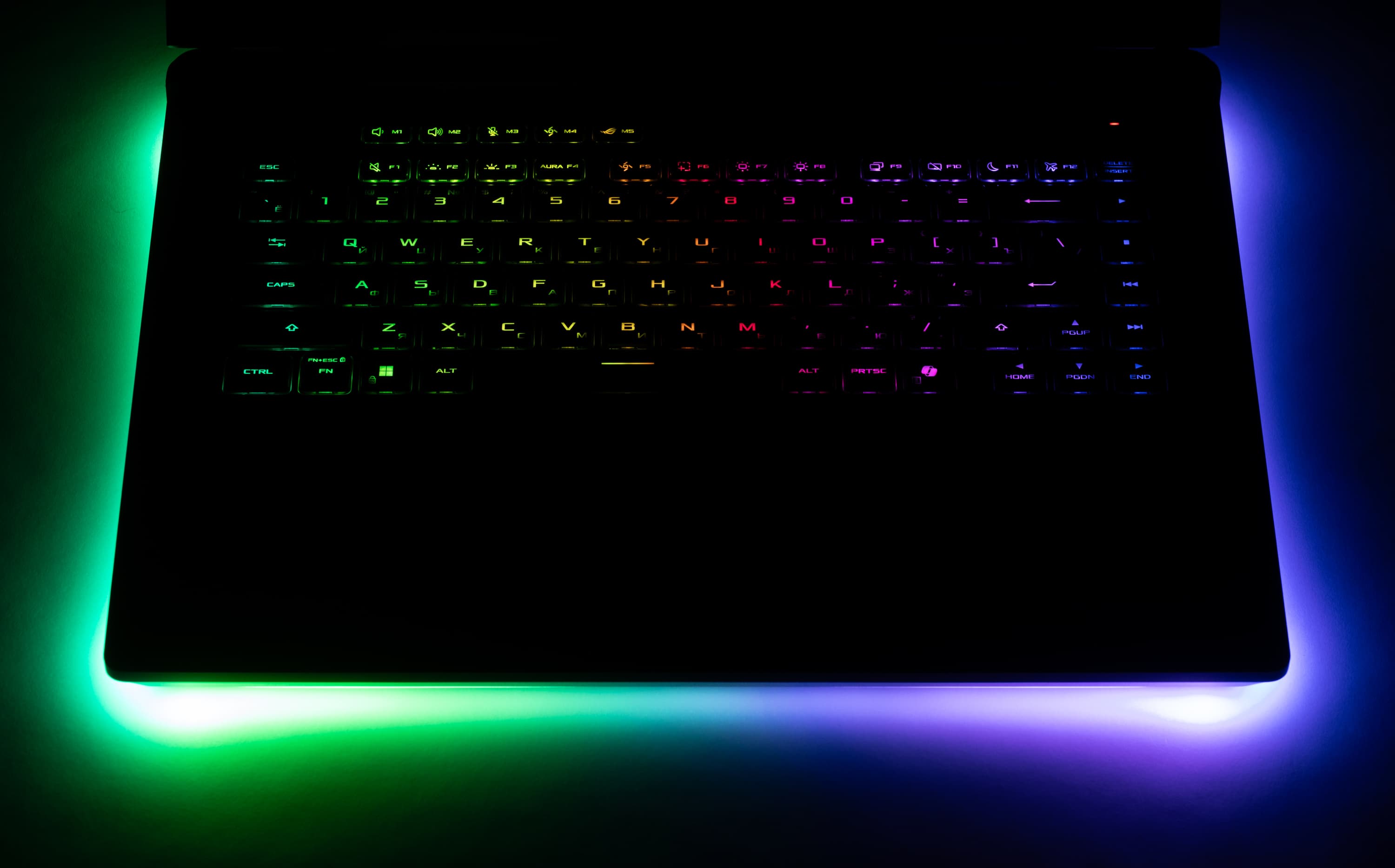 Клавиатура снабжена динамической подсветкой (per key RGB) с тремя уровнями яркости (четвертое состояние — подсветка выключена). Увеличение свечения производителя аккордом Fn+F3, уменьшение — Fn+F2. Подсвечиваются сами символы на клавишах и немного их контуры. Зона подсветки под клавишами заметна хорошо и в темноте может раздражать. Распределение света не позволяет хорошо различить символы кириллицы.
