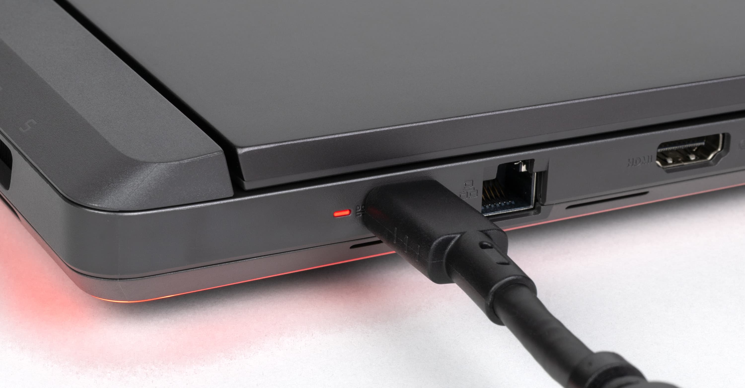 На левой боковой панели расположены: проприетарный разъем для подключения адаптера питания, сетевая розетка RJ-45, видеовыход HDMI, порт USB 3.2 Gen2 Type-А и два Thunderbolt 5, а также комбинированный миниджек для аудиогарнитуры.