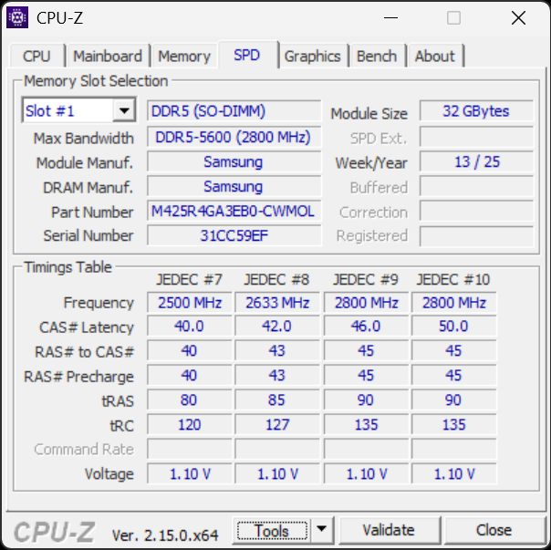 В упомянутом слоте установлен 32-гигабайтный модуль DDR5-5600 Samsung M425R4GA3EB0.