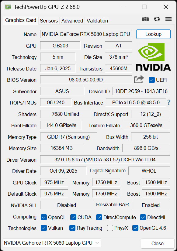 | Видеоподсистема | интегрированная: Intel Xe Graphics (64 исполняемых блока) дискретная: Nvidia GeForce RTX 5080 Laptop с 16 ГБ GDDR7, 1,5—2,3 ГГц, 175 Вт | |