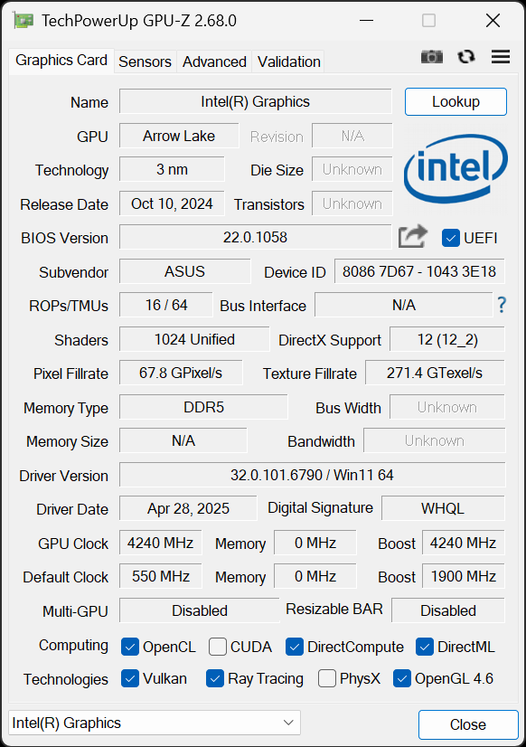 Показать адаптер беспроводной связи мы не сможем, так как это требует основательной разборки и специального инструментария. Известно, что это современный трехдиапазонный (2,4/5/6 ГГц) высокоскоростной Intel BE200 (Wi-Fi 7, IEEE 802.11be).
