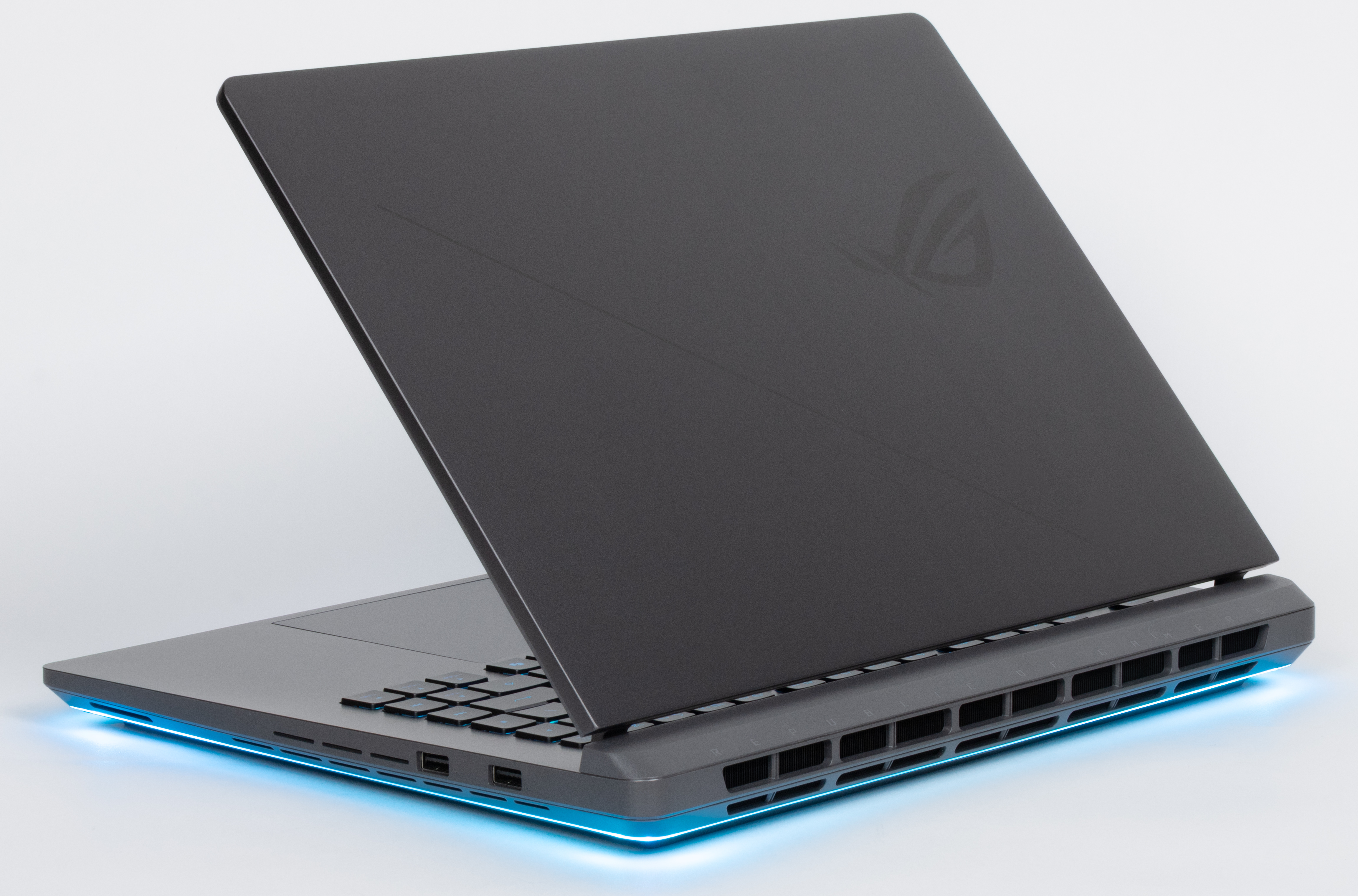 Оформление крышки спокойное, лаконичное. Кроме традиционного лого ROG имеется лишь тонкая диагональная полоса. Реализована подсветка по периферии корпуса.