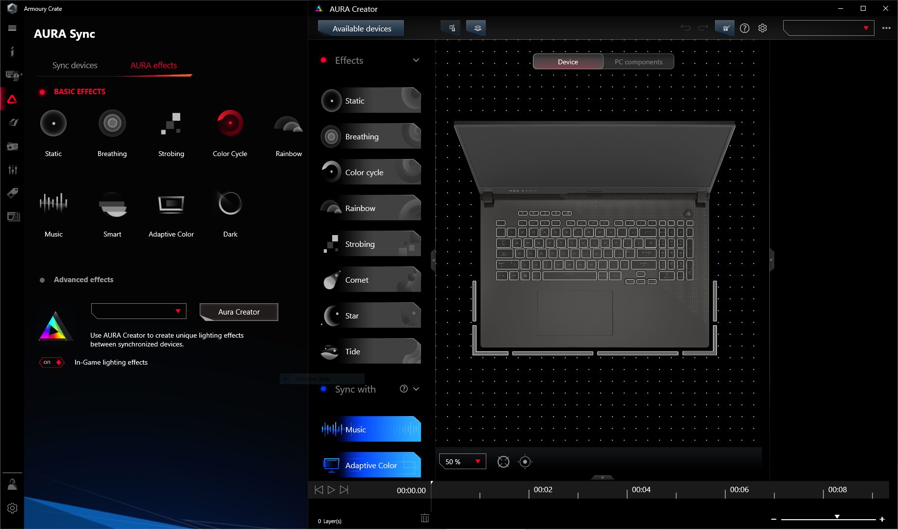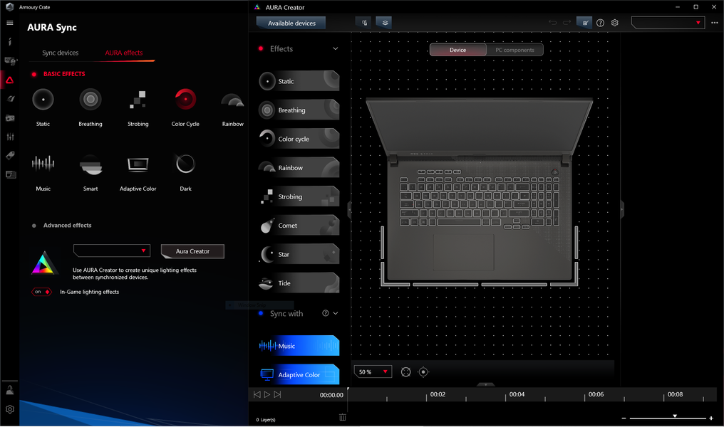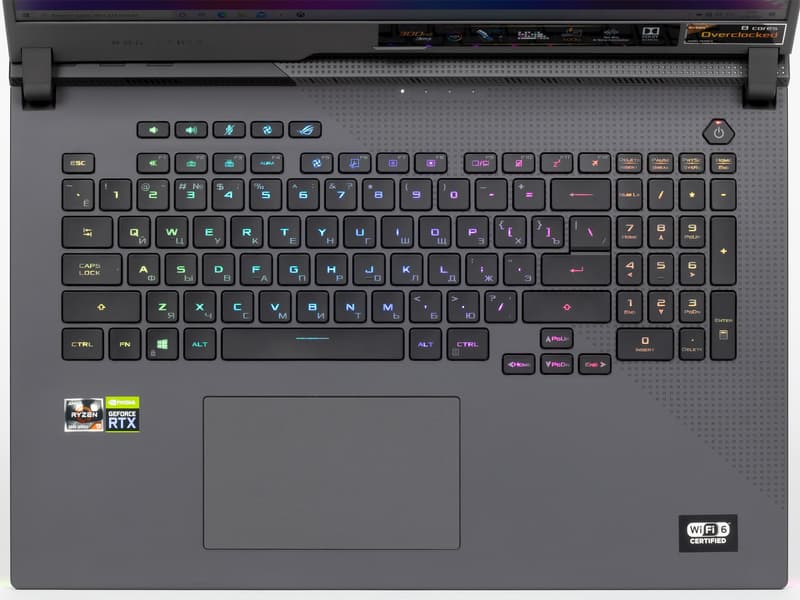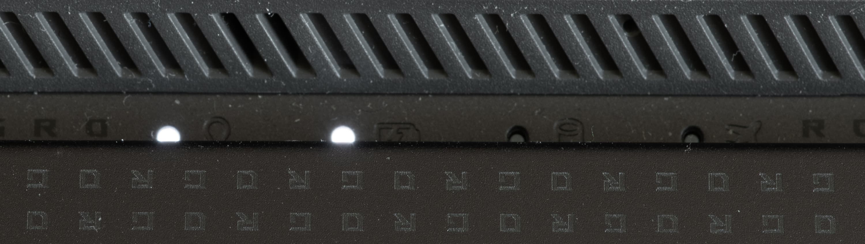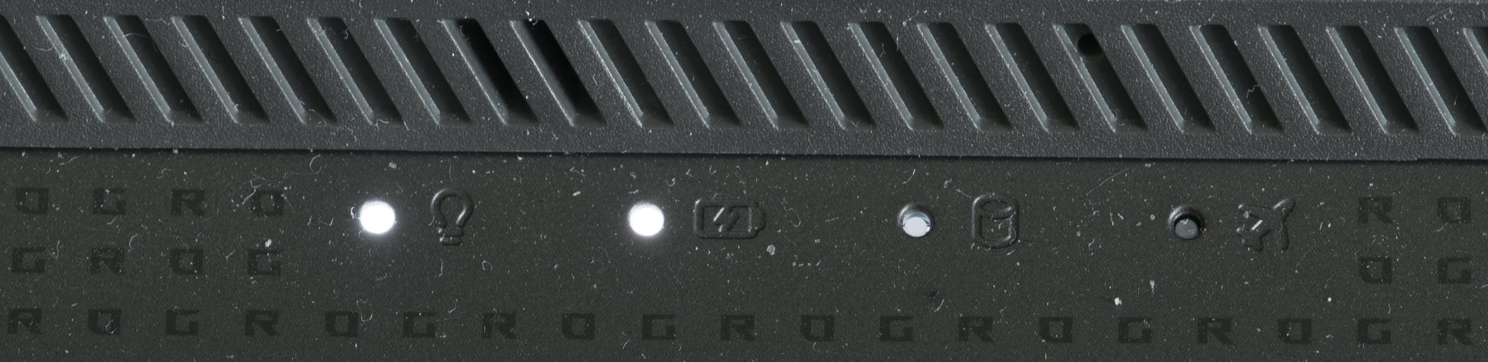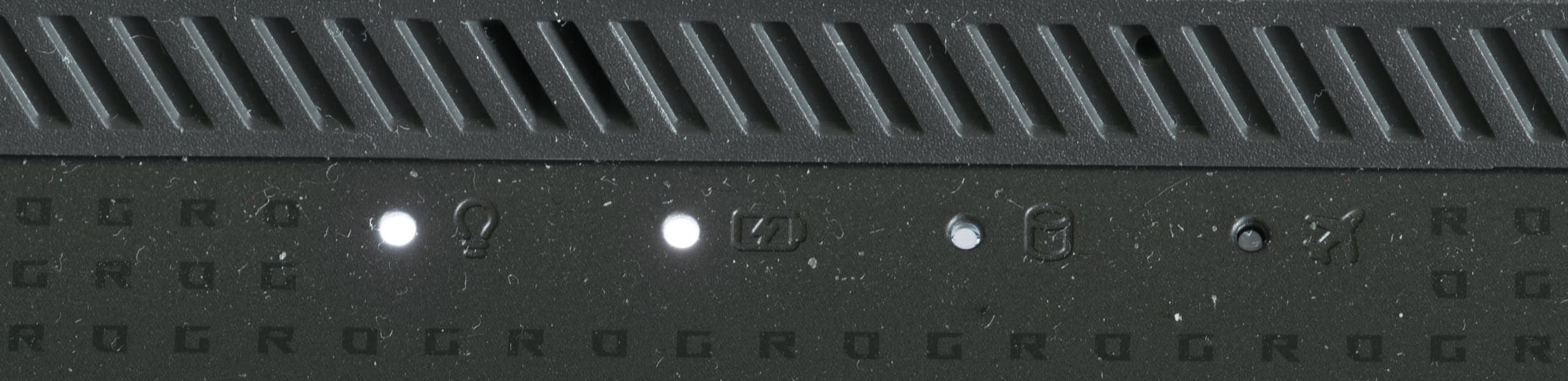 Настройка режимов свечения производится в фирменном приложении Armoury Crate, быстрый доступ к которому осуществляется нажатием первой справа кнопки в самом верхнем ряду клавиатуры с нанесенным на нее логотипом ROG. Синхронно с клавиатурой с трех сторон подсвечивается корпус ноутбука и поверхность, на которой он располагается. Это реализовано благодаря пластмассовой световодной вставке спереди и по бокам. Режим подсветки соответствует профилям Aura (вызов аккордом Fn+F4):