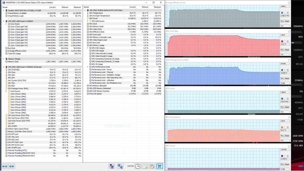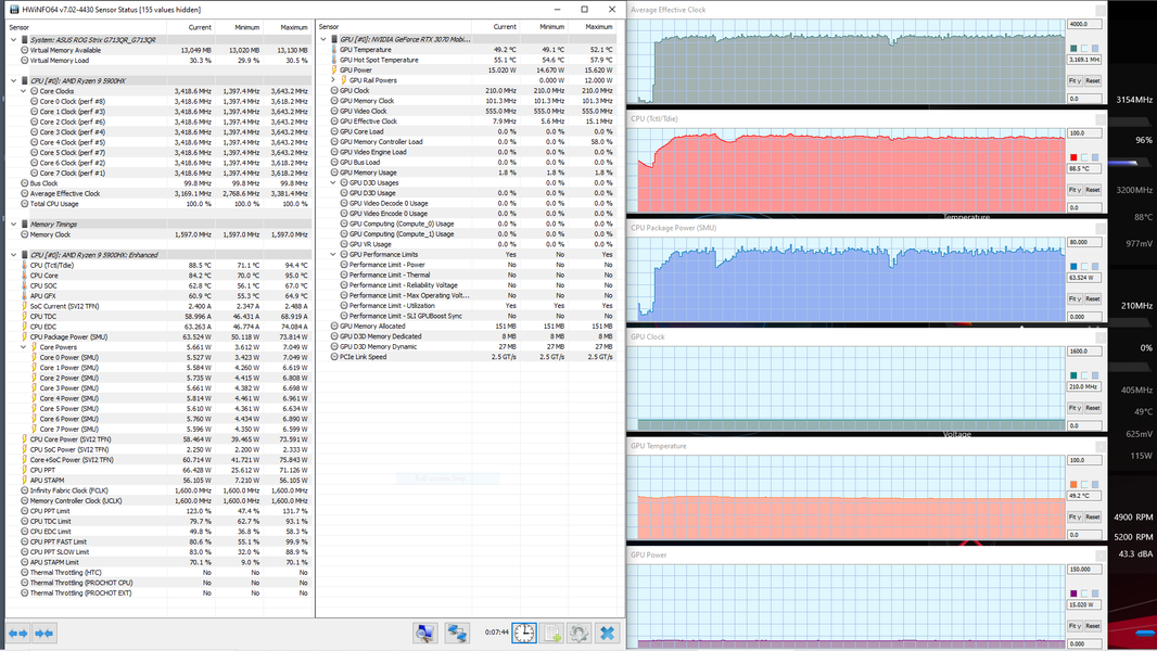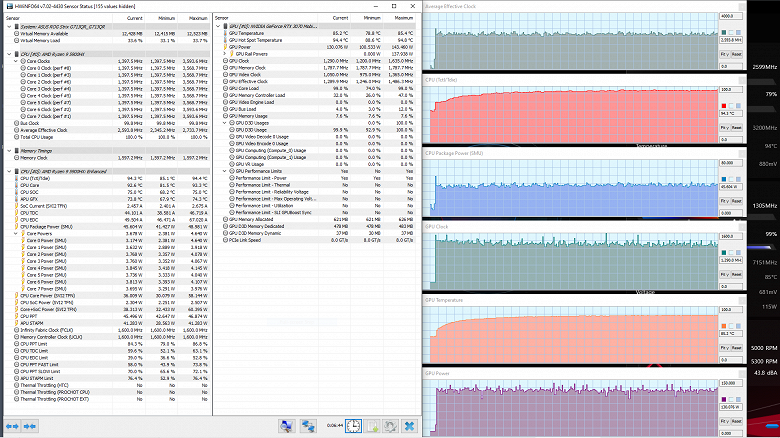 При максимальной нагрузке одновременно на CPU и GPU налицо как бы объединение графиков процесса для каждого из вычислителей, нагруженных по отдельности. Налицо первоначальные всплески, последующая стабилизация тактовой частоты CPU при 2,5 ГГц и потребляемой им мощности при 35 Вт вплоть до пятой минуты, после чего происходит понижение частоты до 2,12 ГГц и потребления — до 25 Вт. До истечения первой минуты автоматика пытается стабилизировать частоту GPU на уровне 0,5 ГГц, его потребление — на уровне 59 Вт, но затем первый показатель понижается до 0,35 ГГц, а второй — до 54 Вт. В первом периоде стабилизации кулеры раскручиваются до 3700 об/мин (34 дБА), к пятой минуте замедляются до 3000 об/мин. Далее скорость их вращения остается неизменной.