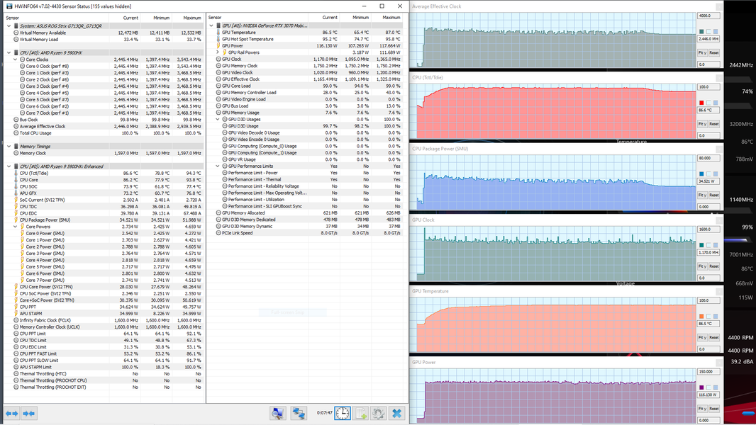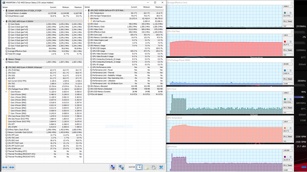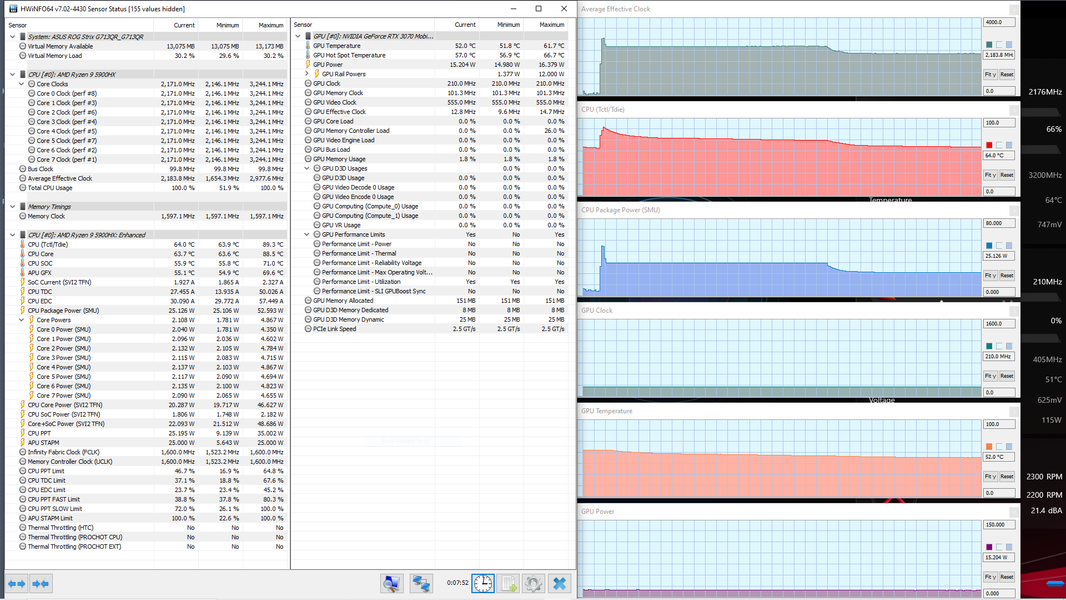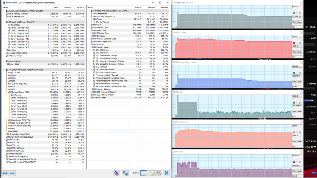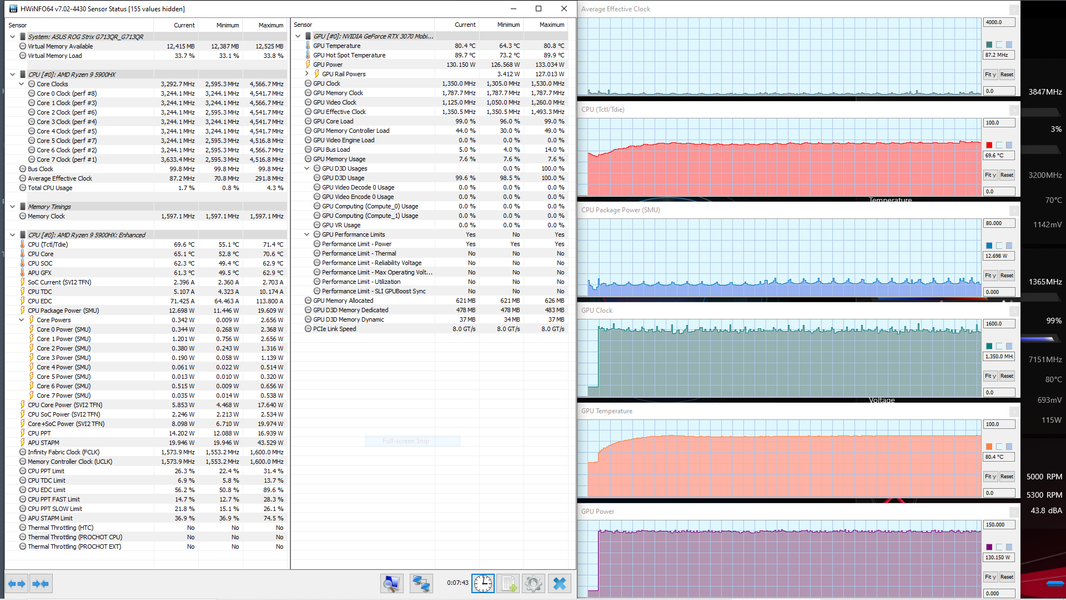 Мобильные видеокарты GeForce RTX 30, созданные на основе архитектуры Ampere, были анонсированы сравнительно недавно, в начале 2021 года. Nvidia указывает для них лишь границы диапазона рабочих характеристик, в то время как параметры работы этих решений в составе конкретной конфигурации должны определяться производителями ноутбуков. На сайте Nvidia для GeForce RTX 3070 Laptop указана частота с ускорением от 1290 до 1620 МГц и потребление 80—125 Вт и более. Asus в своем интернет-каталоге приводит цифры 1660 МГц и 115 Вт с динамическим разгоном до 130 Вт. Что касается потребляемой мощности, то ее на этом уровне мы подтвердить можем, а вот максимальная частота была достижима лишь в краткосрочных пиках.