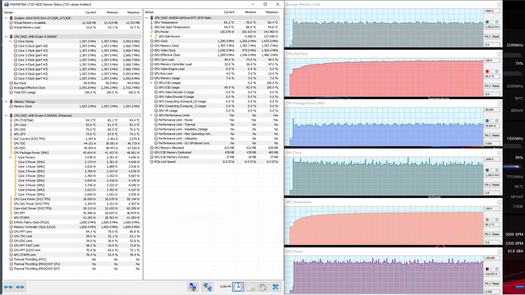 По мотивам проведенных испытаний складывается впечатление о том, что система охлаждения ноутбука обладает достаточным ресурсом, чтобы справляться даже с максимальными режимами работы центрального процессора и видеокарты. Несмотря на разогрев CPU до 94 °C и GPU до 87 °C, мы не получили данных о перегреве, и центральный вычислитель не доходил до троттлинга ни в одном из режимов. Ограничения по тактовой частоте и уровню потребления, которые вводит автоматика, являются следствием стремления производителя понизить уровень шума, производимого системой охлаждения, и это вполне разумное и оправданное решение.