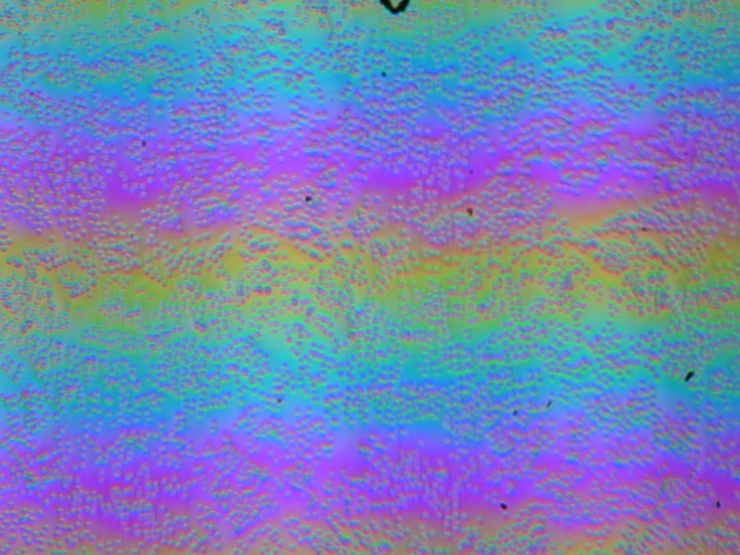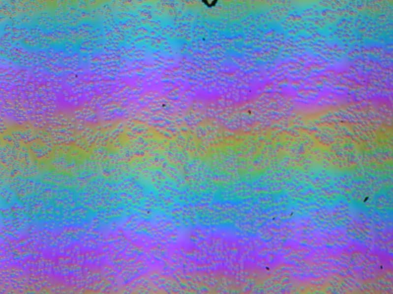 Зерно этих дефектов в несколько раз меньше размеров субпикселей (масштаб этих двух фотографий примерно одинаковый), поэтому фокусировка на микродефектах и «перескок» фокуса по субпикселям при изменении угла зрения выражены слабо, из-за этого нет и «кристаллического» эффекта.