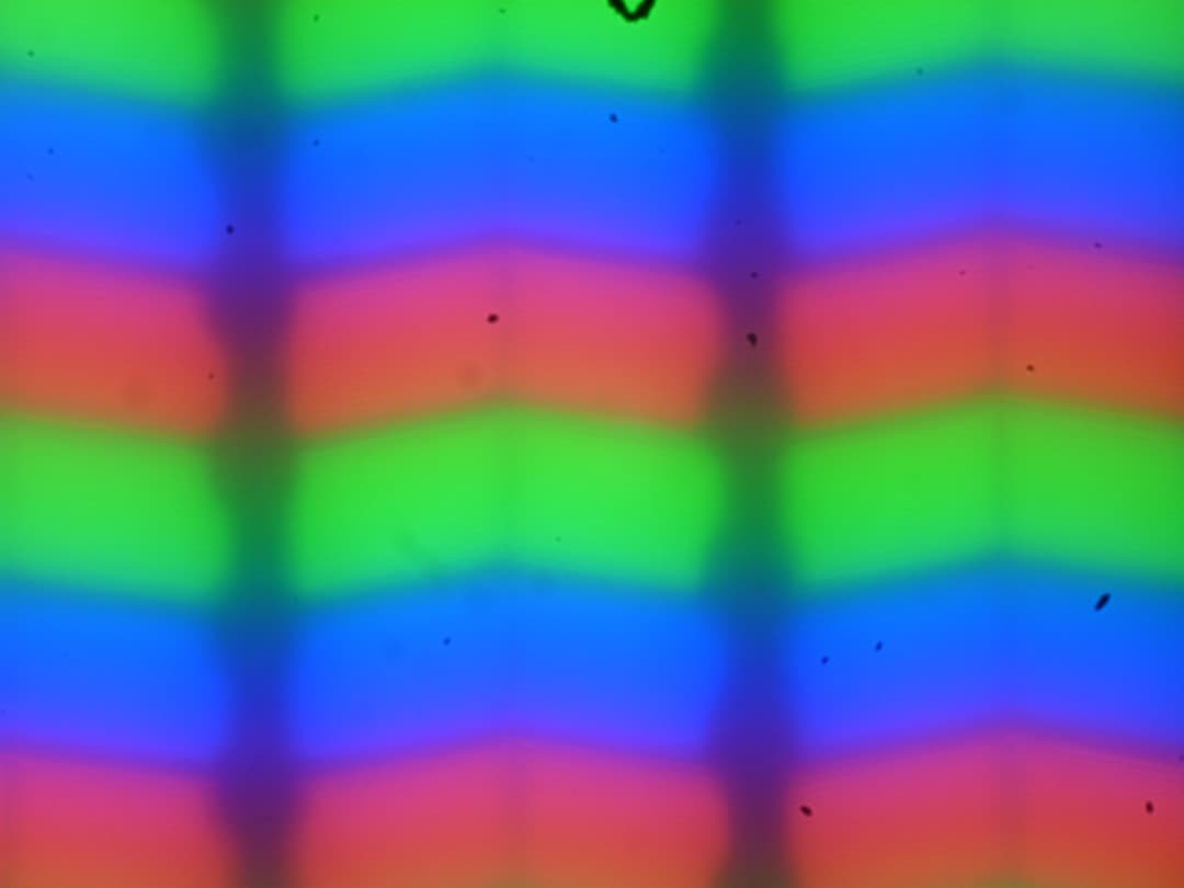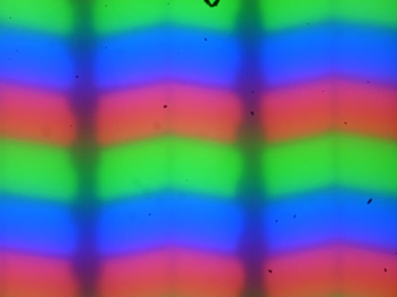В этом ноутбуке используется матрица типа IPS. Микрофотографии демонстрируют типичную для IPS структуру субпикселей (черные точки — это пыль на матрице фотоаппарата):
