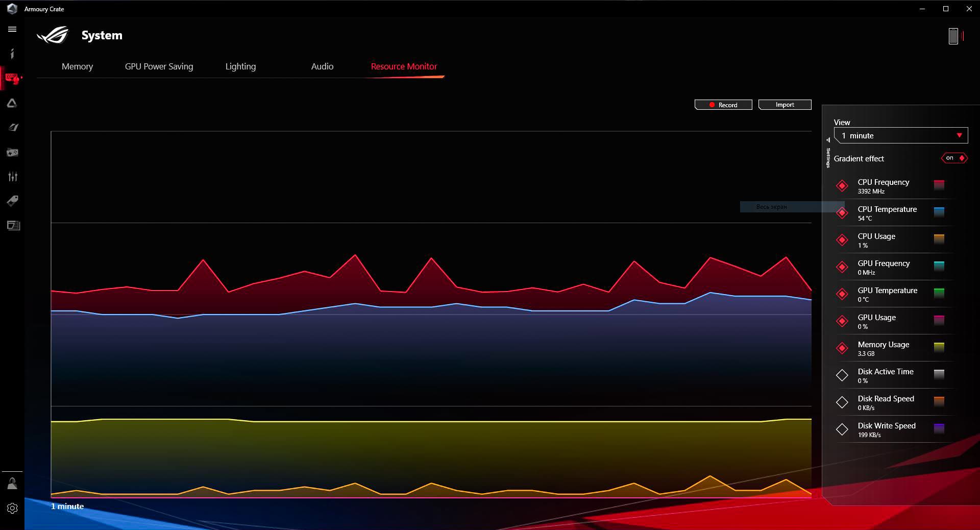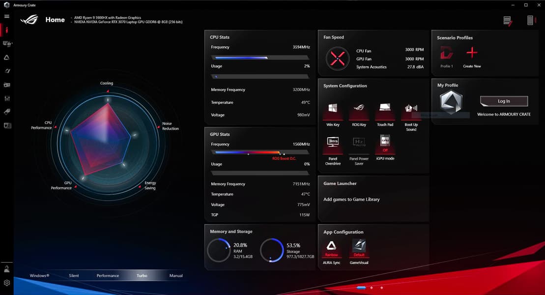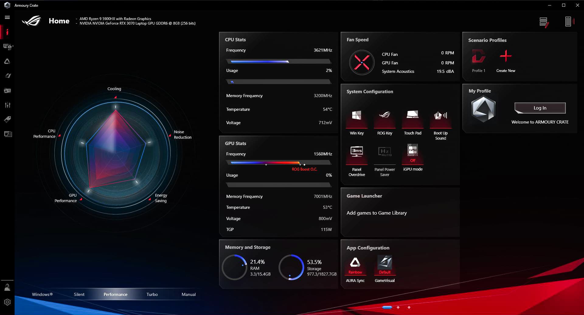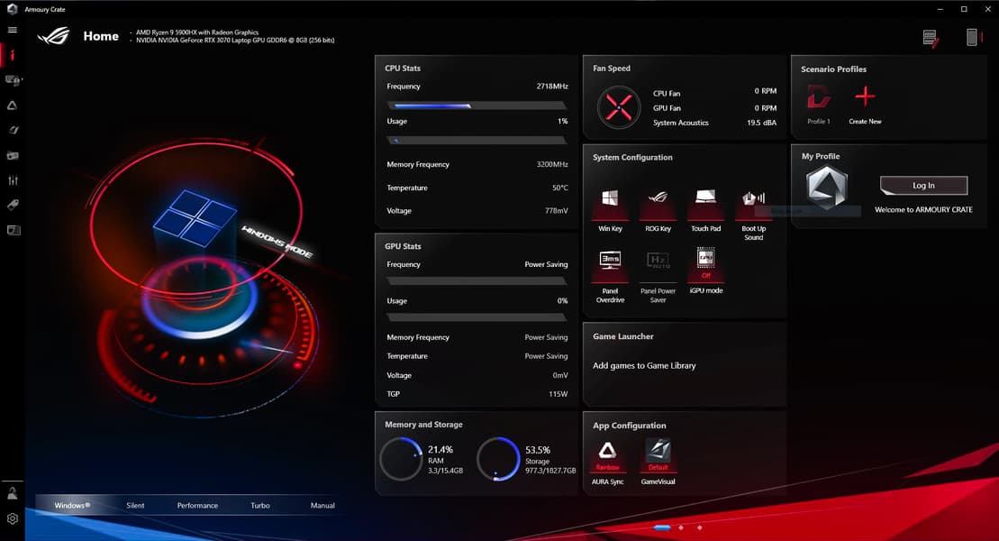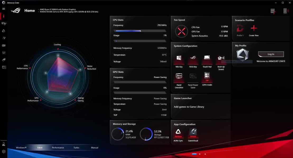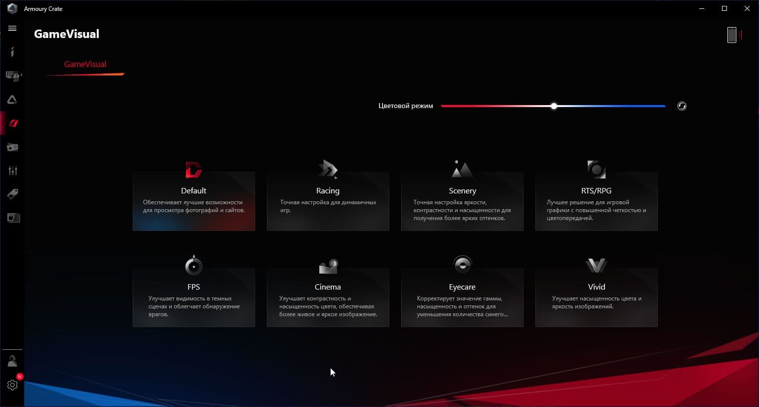 Приложение Armoury Crate отвечает за настройки аппаратных компонентов. Эту утилиту можно запустить нажатием пятой кнопки слева в самом верхнем ряду клавиатуры. Наиболее важная и полезная функция Armoury Crate — выбор пресетов (профилей) работы, определяющих производительность и интенсивность работы кулеров системы охлаждения ноутбука. Из дополнительных возможностей отметим вывод информации о работе вентиляторов и мониторинг низкоуровневых параметров.