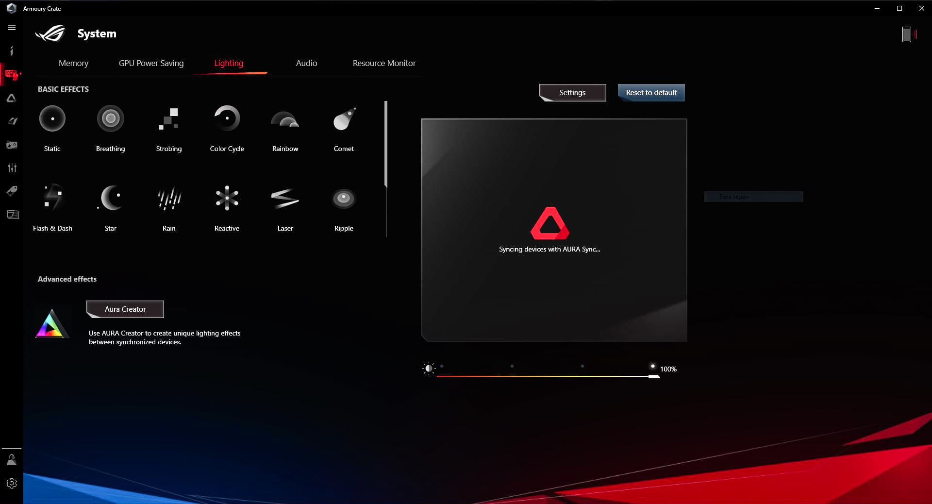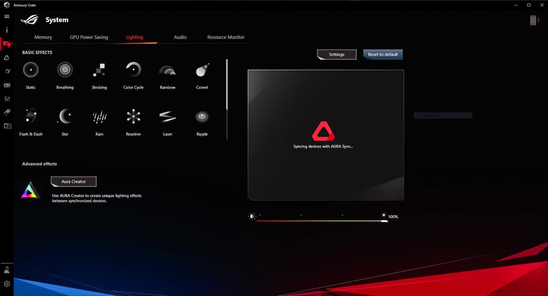 В фирменной утилите Armoury Crate есть управление подсветкой, которое позволяет выбрать один из готовых пресетов и настроить его параметры. Также есть возможность быстро перебирать схемы и менять яркость подсветки прямо с клавиатуры.