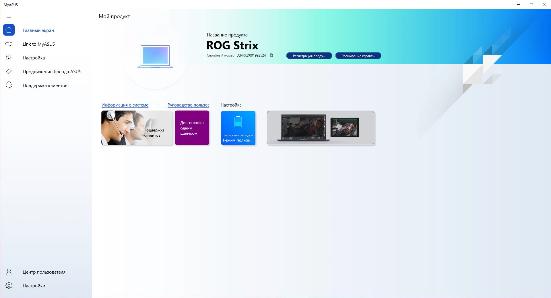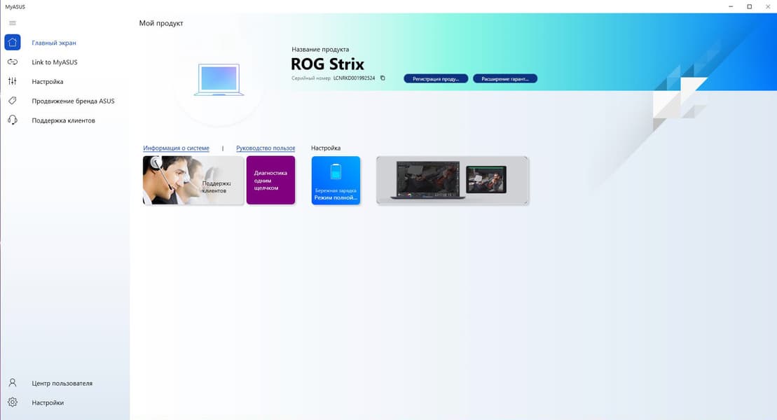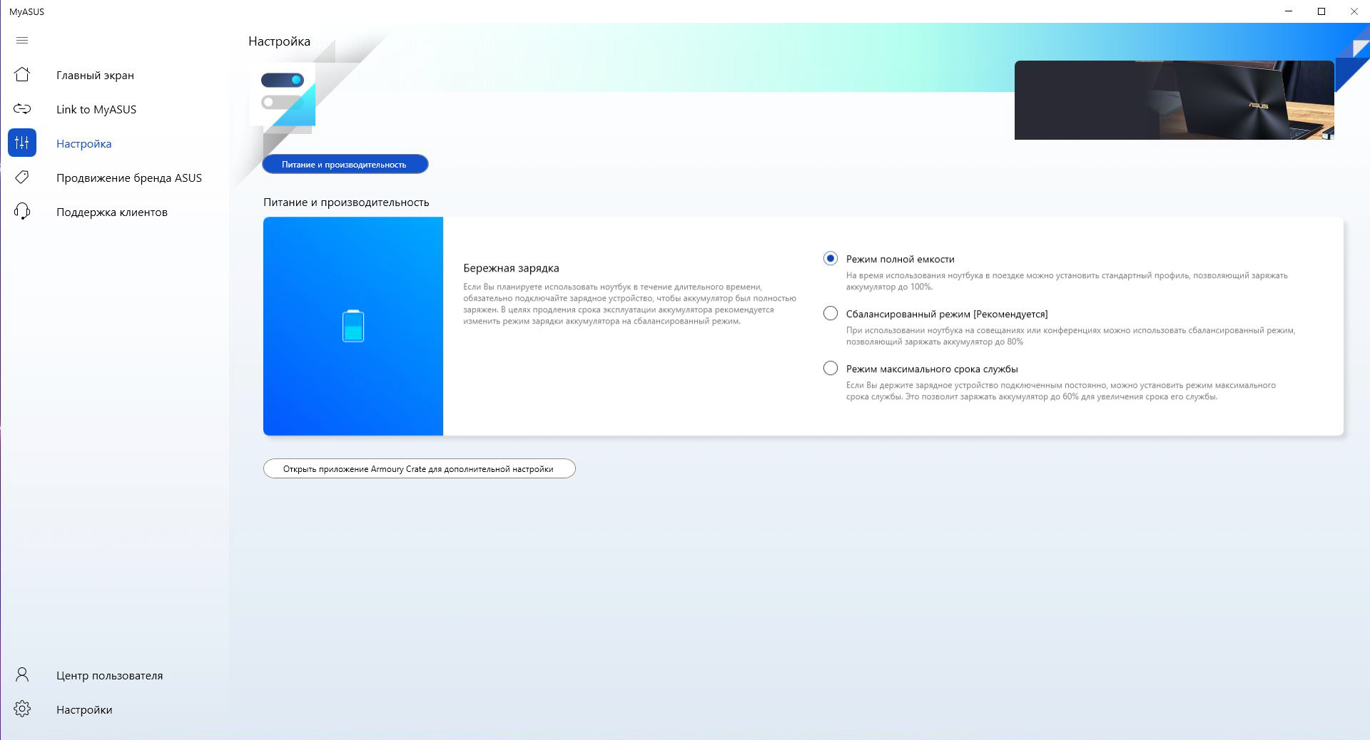 Первая из них — MyAsus — это справочник по системе, комплект средств диагностики, контактов техподдержки, часто задаваемых вопросов. Помимо этого MyAsus позволяет выявлять наличие обновлений драйверов и фирменных приложений. В плане аппаратных настроек здесь предусмотрена возможность включить режим продления службы батареи путем ее неполной зарядки (подробнее см. ниже).