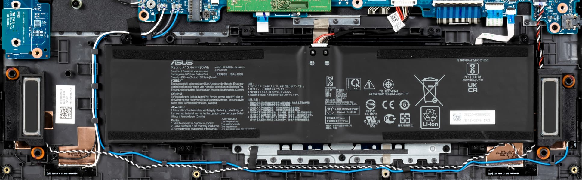 Открутив 11 винтов, крепящих днище к корпусу, получаем доступ к главным компонентам машины: системе охлаждения, модулям оперативной памяти, SSD-накопителю и батарее. Про последнюю в нашем случае принято говорить «несъемная», так как уже сама попытка снятия нижней крышки означает для владельца нарушение условий соблюдения производителем его гарантийных обязательств. Однако нужно заметить, что батарея не спаяна с корпусом, а крепится к нему при помощи винтов и извлекается при умелом обращении несложно и быстро. Впрочем, мы решительно не советуем этого делать: даже при возникновении потребности в апгрейде разумнее обратиться в авторизованный центр по обслуживанию и ремонту.