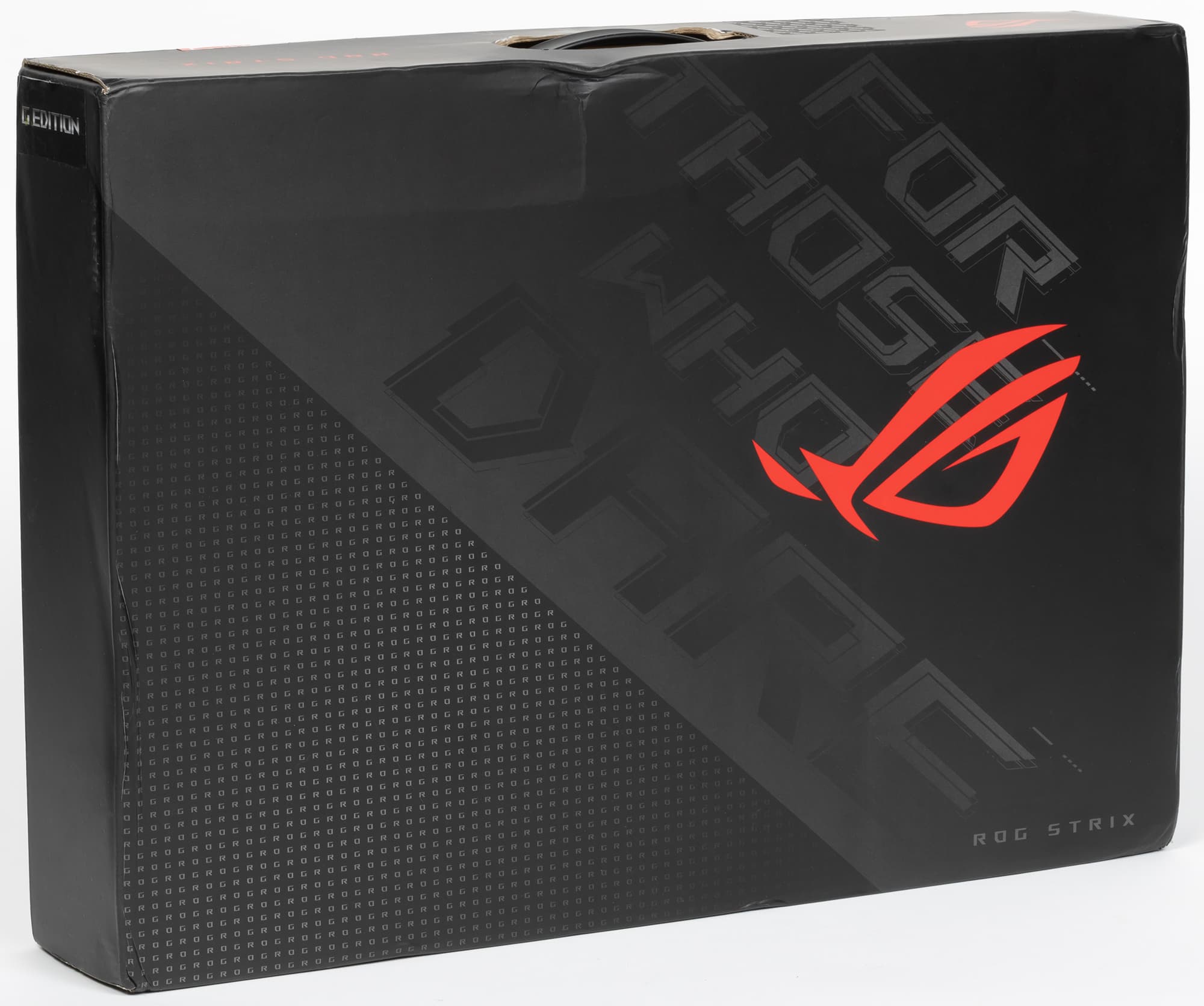 Упаковка ноутбука представляет собой матово-черную коробку с выразительным наружным оформлением, где главенствует красный логотип ROG. Коробка выполнена в виде раскрывающегося чемоданчика со вставленной в него пластмассовой ручкой для переноски. Избавиться от нее, конечно же, можно сразу после приобретения, но это вряд ли станет рациональным шагом, поскольку внутри имеются раздельные емкости для хранения адаптера питания и всяких аксессуаров, не входящих в комплект поставки, но необходимых в повседневной практике геймера (мышь, гарнитура и т. д.). Эти причиндалы намного удобнее переносить в виде общего багажного места с ноутбуком, нежели по отдельности.