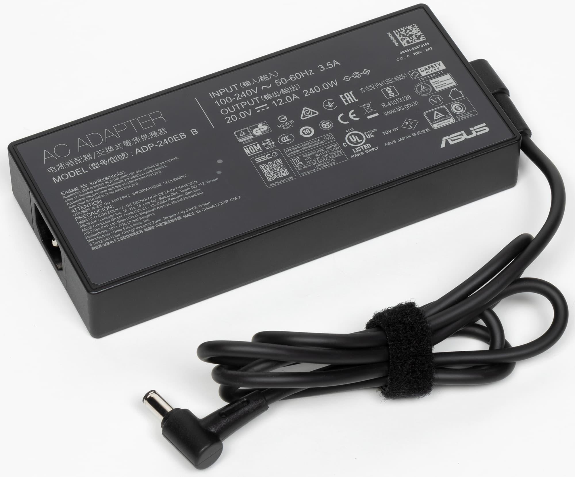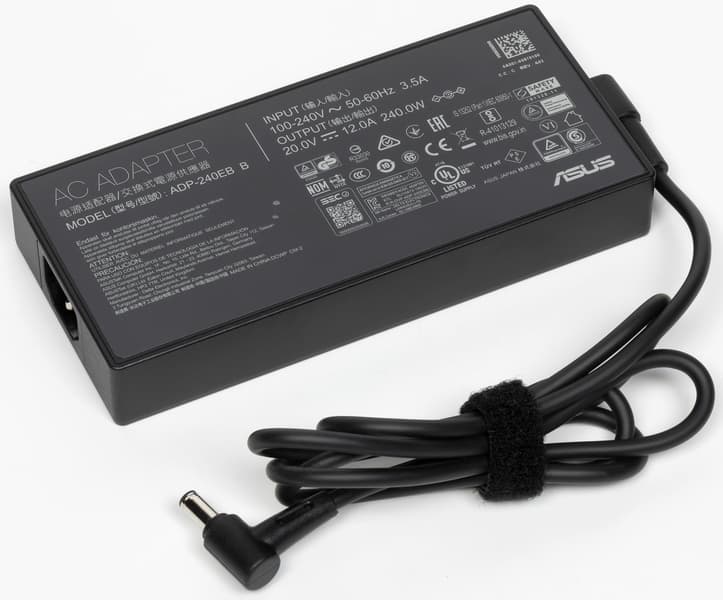 Помимо самой машины в комплекте поставки обнаруживается довольно тяжелый (559 г) адаптер питания, который подходит для работы от сети переменного тока 50—60 Гц при напряжении 100—240 В и обеспечивает на выходе 20 В при силе тока 12 А (мощность 240 Вт).