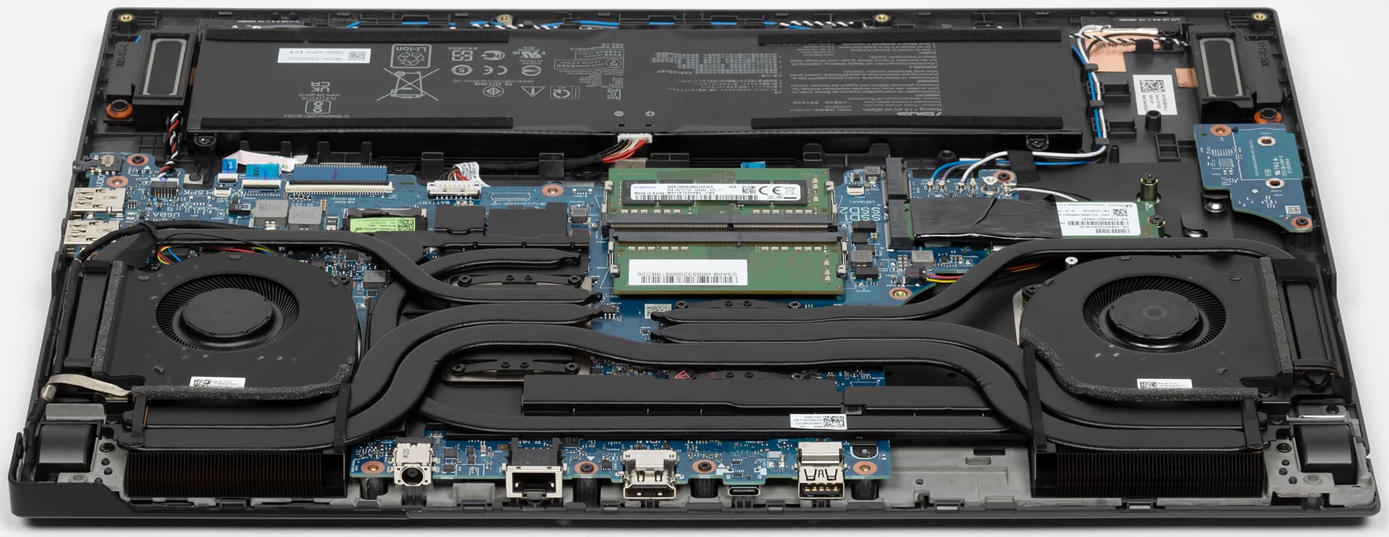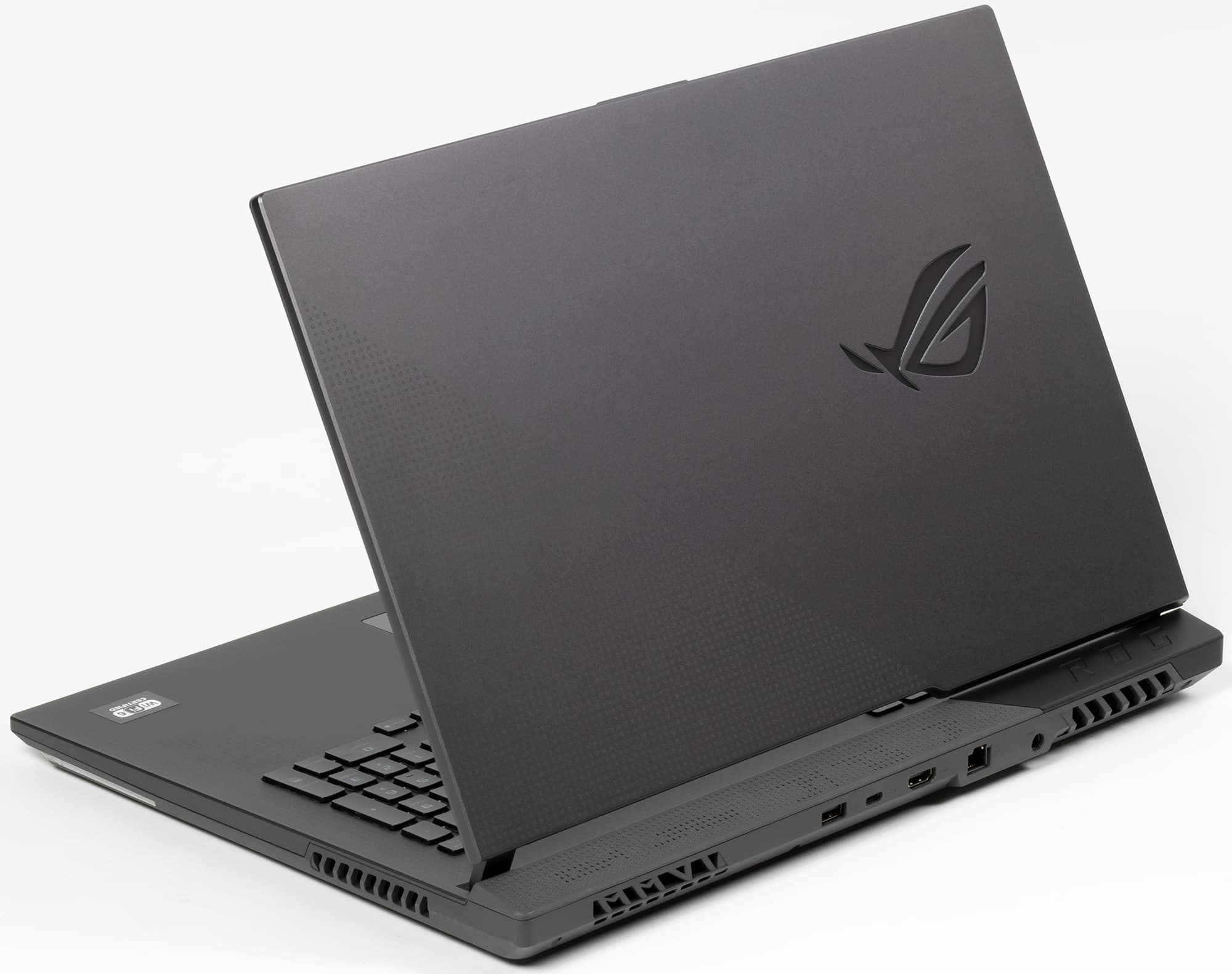 Толщина корпуса у Asus ROG Strix G17 G713QR (без учета ножек) составляет всего 23 мм — для мощной портативной игровой системы это совсем немного. Поэтому система охлаждения использует внутренний объем с максимальной эффективностью, и движение воздуха в нем происходит в шести направлениях одновременно: относительно холодный забортный поступает через отверстия на днище корпуса и на декоративных решетках верхней панели — там, где последняя имеет возвышение, — а выброс горячего производится двумя вентиляторами через четыре радиатора (два назад, один направо и один налево).