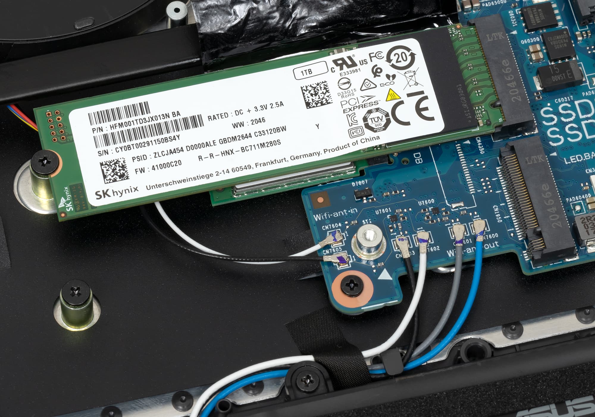 В ноутбуке установлен твердотельный накопитель (SSD) формата M.2, обладающий неформатированнной емкостью 1 ТБ. В рабочей конфигурации со служебными разделами на нем доступно 933 ГБ, а после развертывания Windows 10 и стандартного набора приложений — 883 ГБ. На материнской плате также установлен слот для второго накопителя аналогичного типа, который можно использовать для апгрейда.