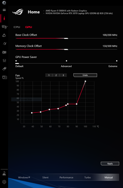 Профиль Manual позволяет вручную построить кривую реакции кулеров на нагрев CPU и GPU, дополнительно разогнать видеокарту и ее память. Также предлагается регулировка лимитов потребления процессора, SPL и SPPT. Это очень ценный инструмент инструмент для сведущего пользователя, в обычных ноутбуках нельзя встретить ничего подобного.