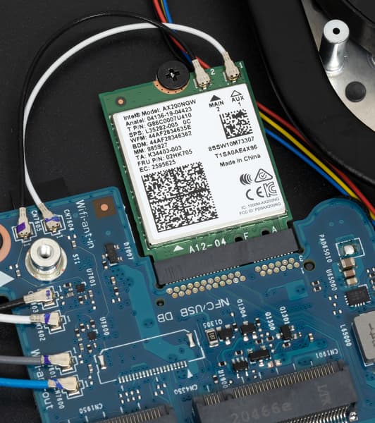 Под первым (занятым) слотом для SSD-накопителя находится адаптер беспроводной связи Intel Wi-Fi 6 AX200 (802.11ax).
