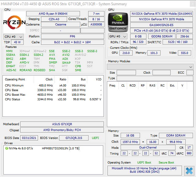 Мы займемся испытаниями модели, которая располагает наиболее высокопроизводительным процессором AMD Ryzen 9 5900HX, очень мощной, но не самой производительной видеокартой Nvidia GeForce RTX 3070 Laptop с 8 ГБ видеопамяти, 16 ГБ ОЗУ и твердотельным накопителем вместимостью 1 ТБ. Подробные характеристики приводим ниже.