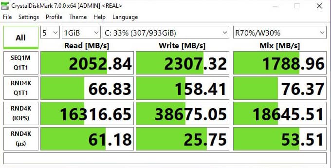 В роли хранилища установленных программ и пользовательских данных выступает твердотельный накопитель емкостью 1 ТБ SK hynix HFM001TD3JX013N. Он демонстрирует весьма высокие скорости последовательных и рандомных чтения и записи.