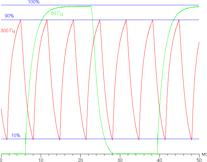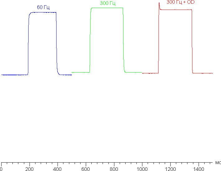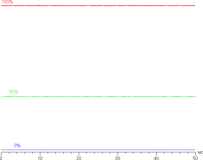 На любом уровне яркости значимая модуляция подсветки отсутствует, поэтому нет и никакого мерцания экрана. В доказательство приведем графики зависимости яркости (вертикальная ось) от времени (горизонтальная ось) при различных значениях настройки яркости: