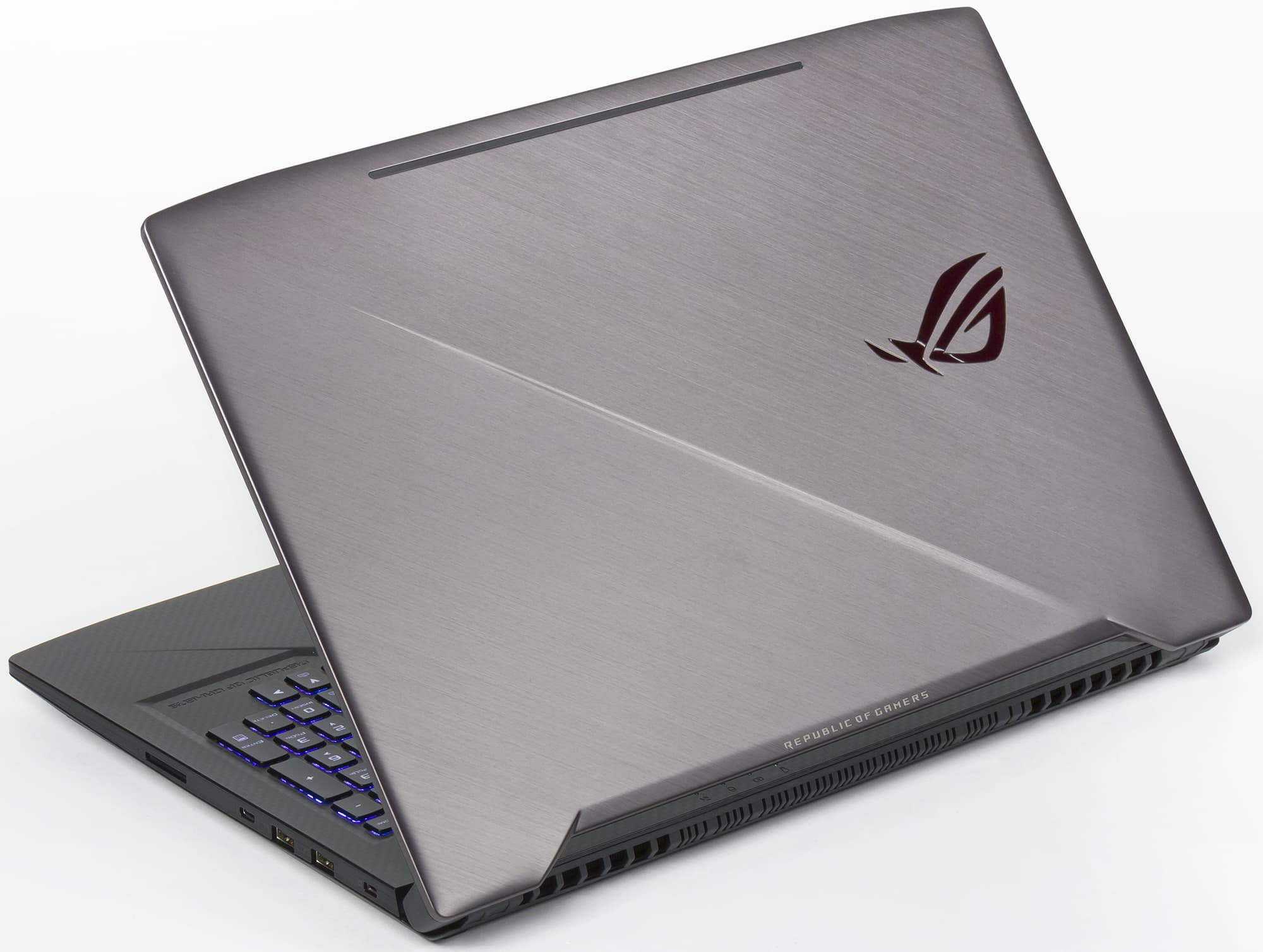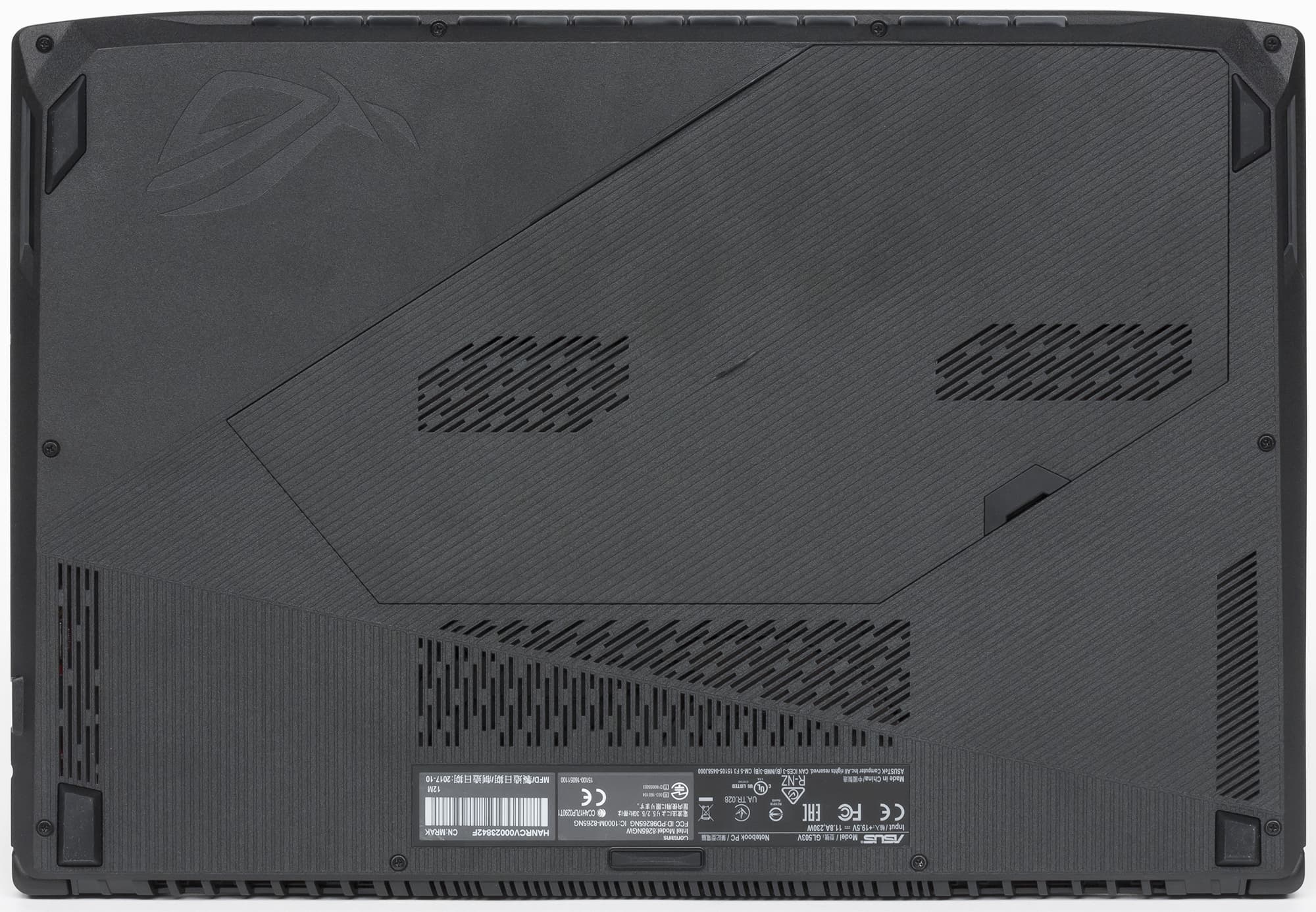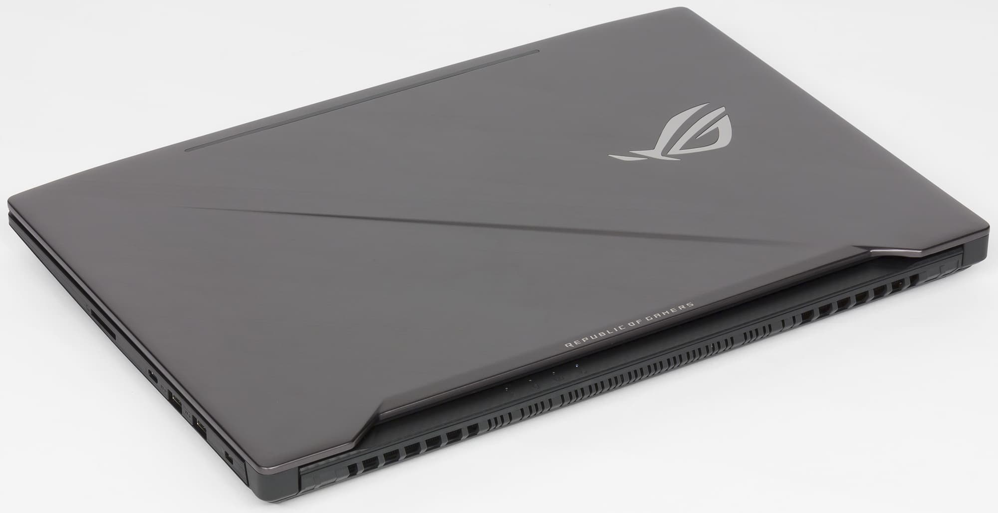 Корпус ноутбука Asus ROG Strix GL503VS Scar Edition выполнен из металла и пластика. Крышка ноутбука сверху выполнена из тонкого листа алюминия темно-серебристого цвета.