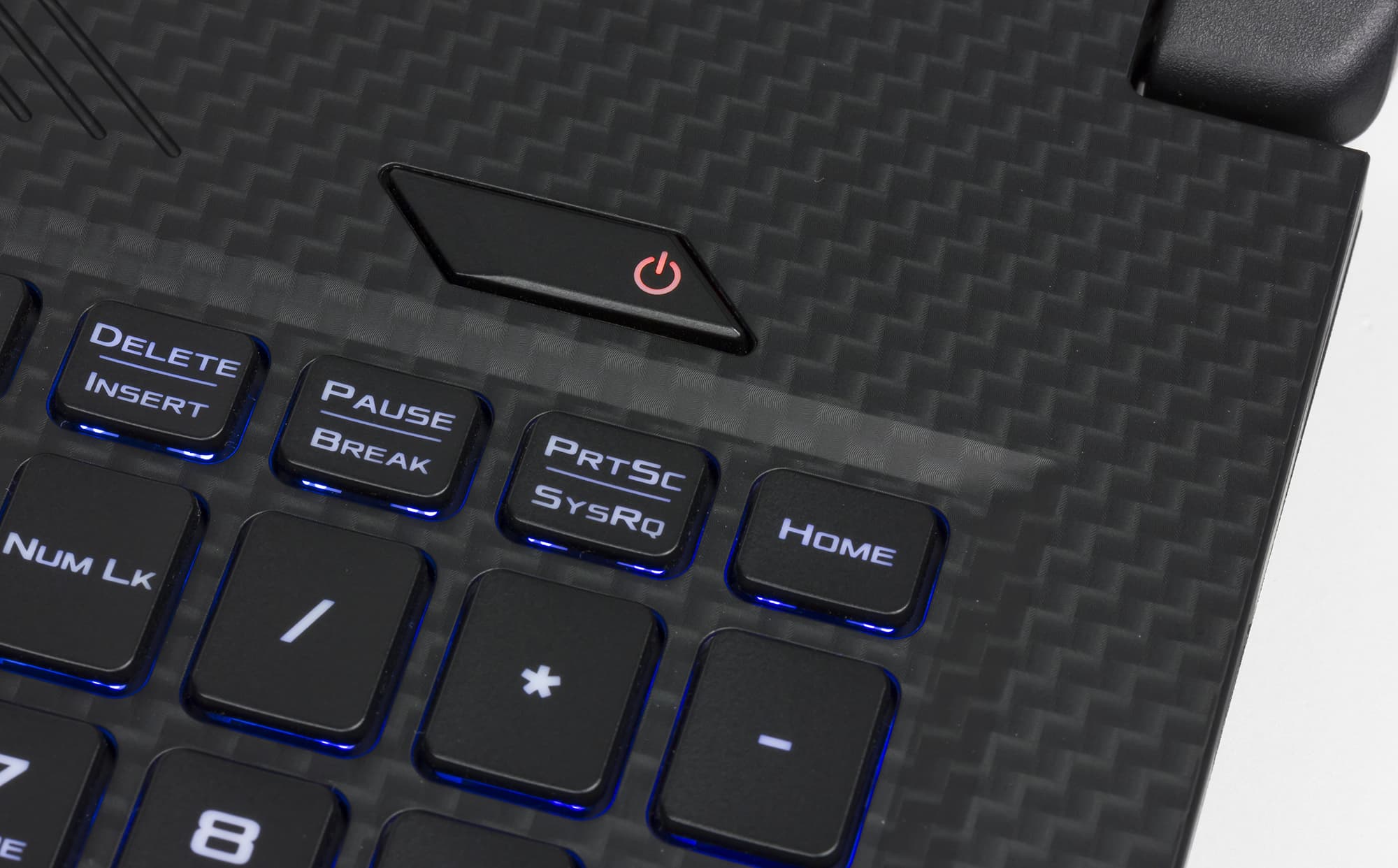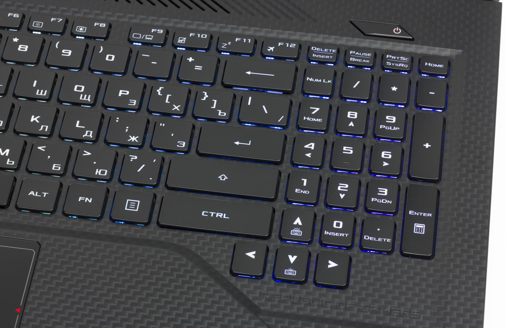 В левом углу рабочей поверхности, над клавиатурой, есть четыре отдельные клавиши управления ноутбуком. Это фирменная клавиша с эмблемой ROG, предназначенная для запуска приложения ROG Gaming Center, клавиша включения/отключения микрофона и две клавиши управления громкостью звука.