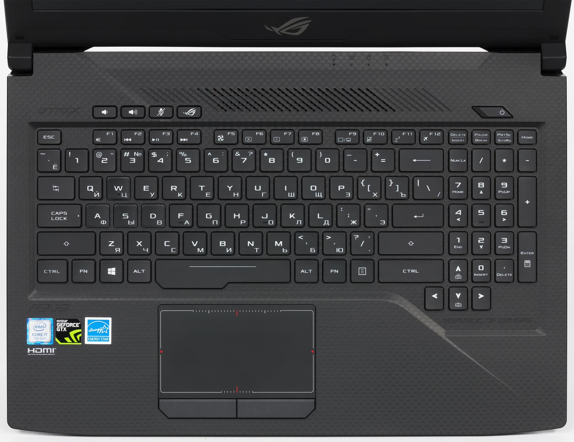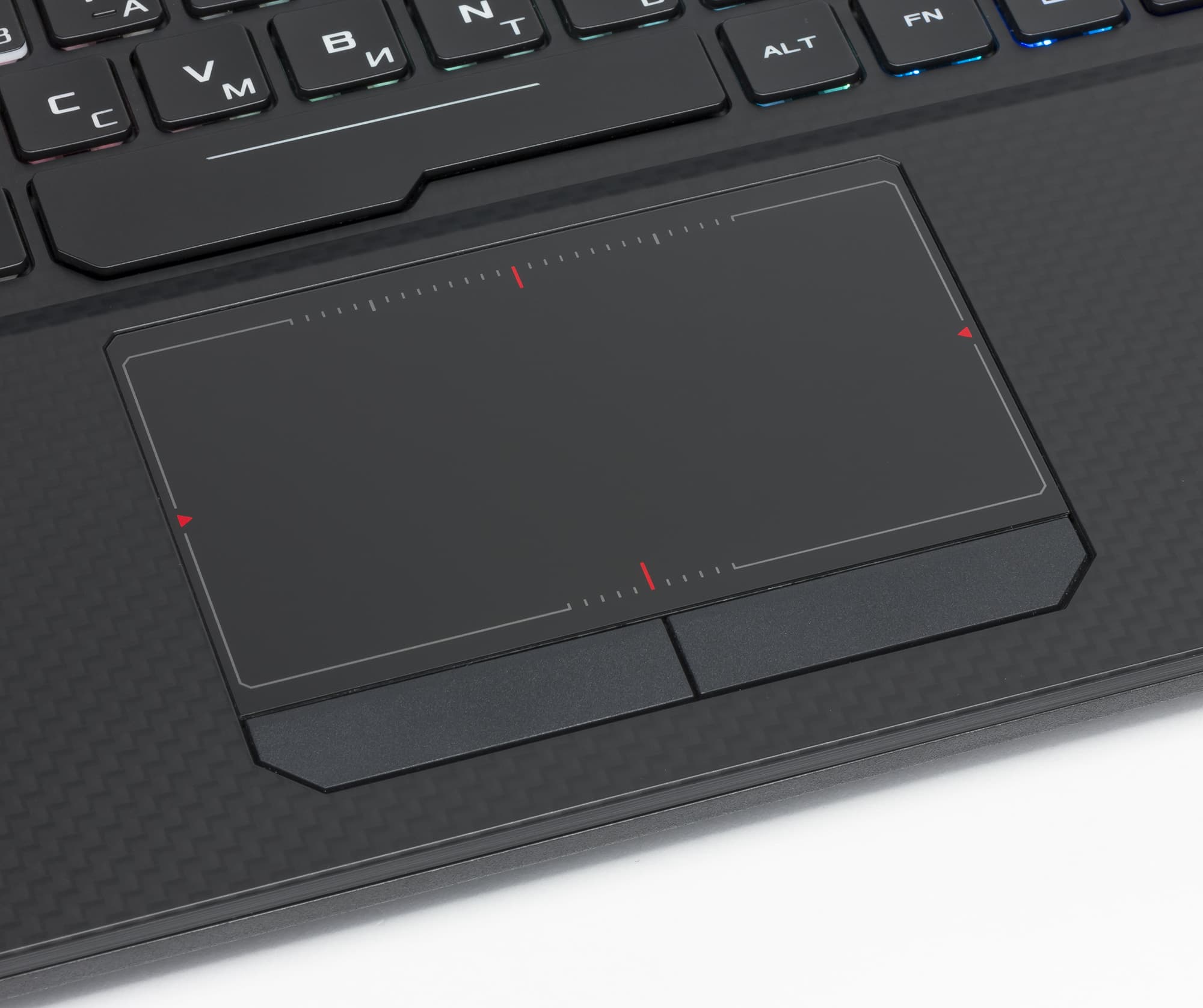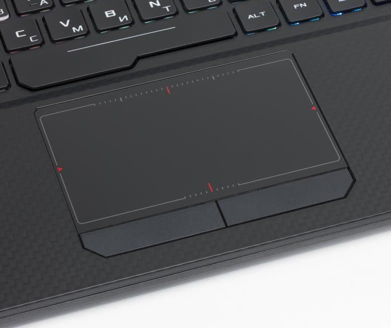 В ноутбуке Asus ROG Strix GL503VS Scar Edition используется классический двухкнопочный тачпад. Размеры его сенсорной поверхности составляют 108×64 мм. Сенсорная поверхность кликпада немного заглублена. Работать с таким тачпадом очень удобно.