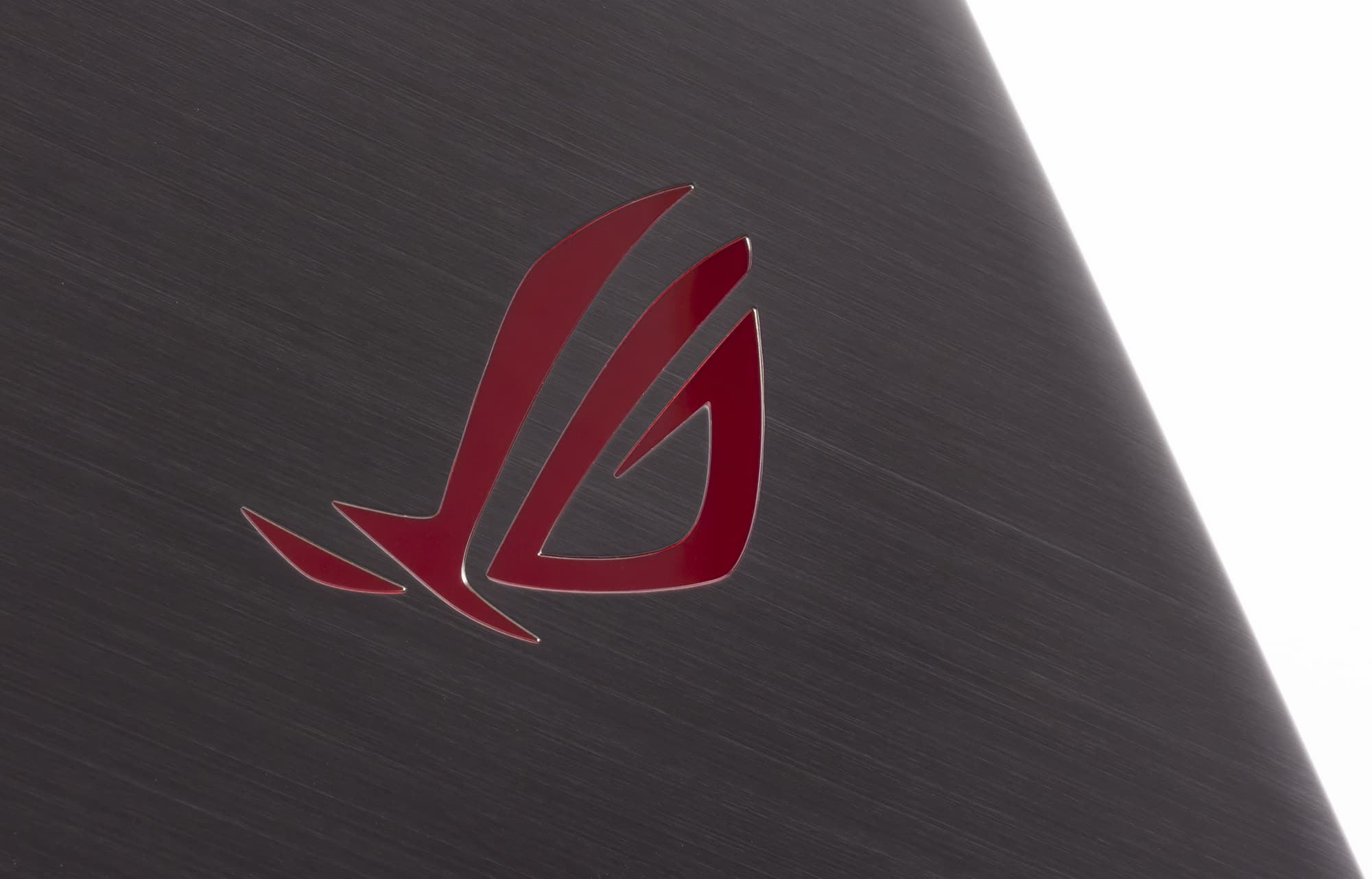 На крышке красуется эмблема игровой серии ROG зеркального цвета, которая подсвечивается красным цветом при включении ноутбука.