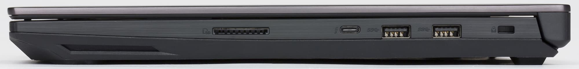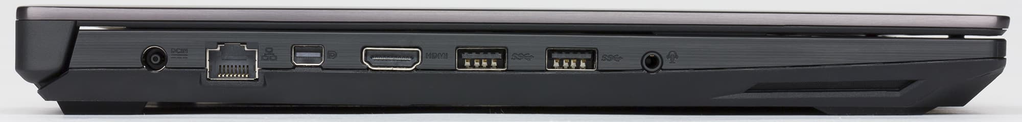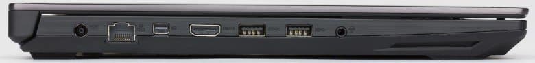 На левом торце корпуса ноутбука расположено два порта USB 3.0 (Type-A), разъем HDMI, разъем Mini-DisplayPort, разъем RJ-45 и комбинированный аудиоразъем типа миниджек. Кроме того, тут же расположен разъем питания.