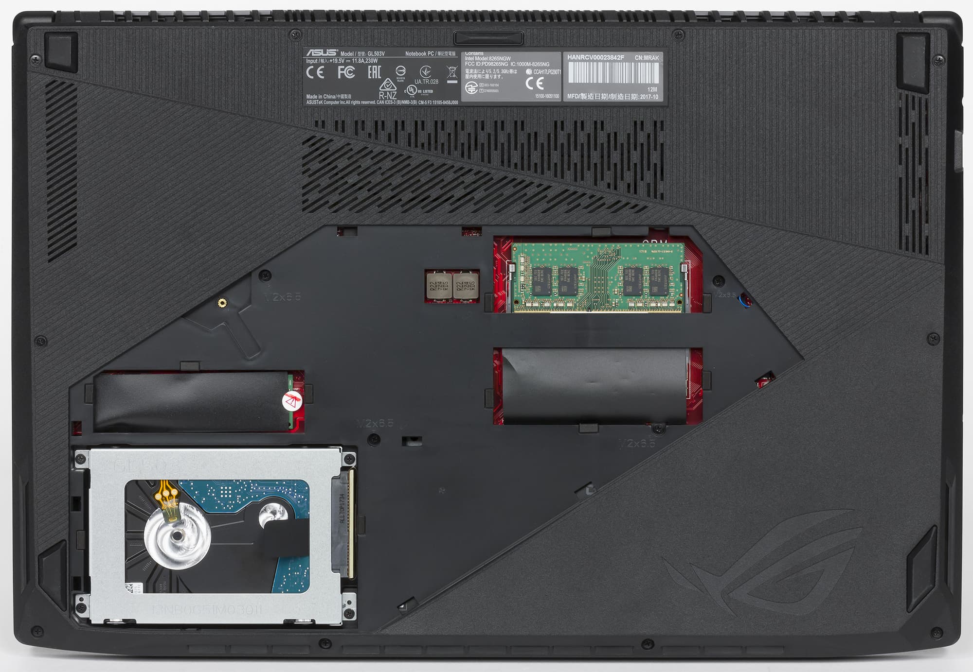 На нижней панели корпуса ноутбука Asus ROG Strix GL503VS Scar Edition имеется лючок в форме скошенного шестигранника. Сняв его, можно получить доступ к HDD, SSD и памяти.