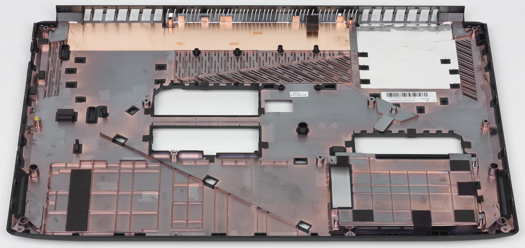 На нижней панели корпуса есть вентиляционные отверстия. Прорезиненные ножки обеспечивают устойчивое положение ноутбука на горизонтальной поверхности.