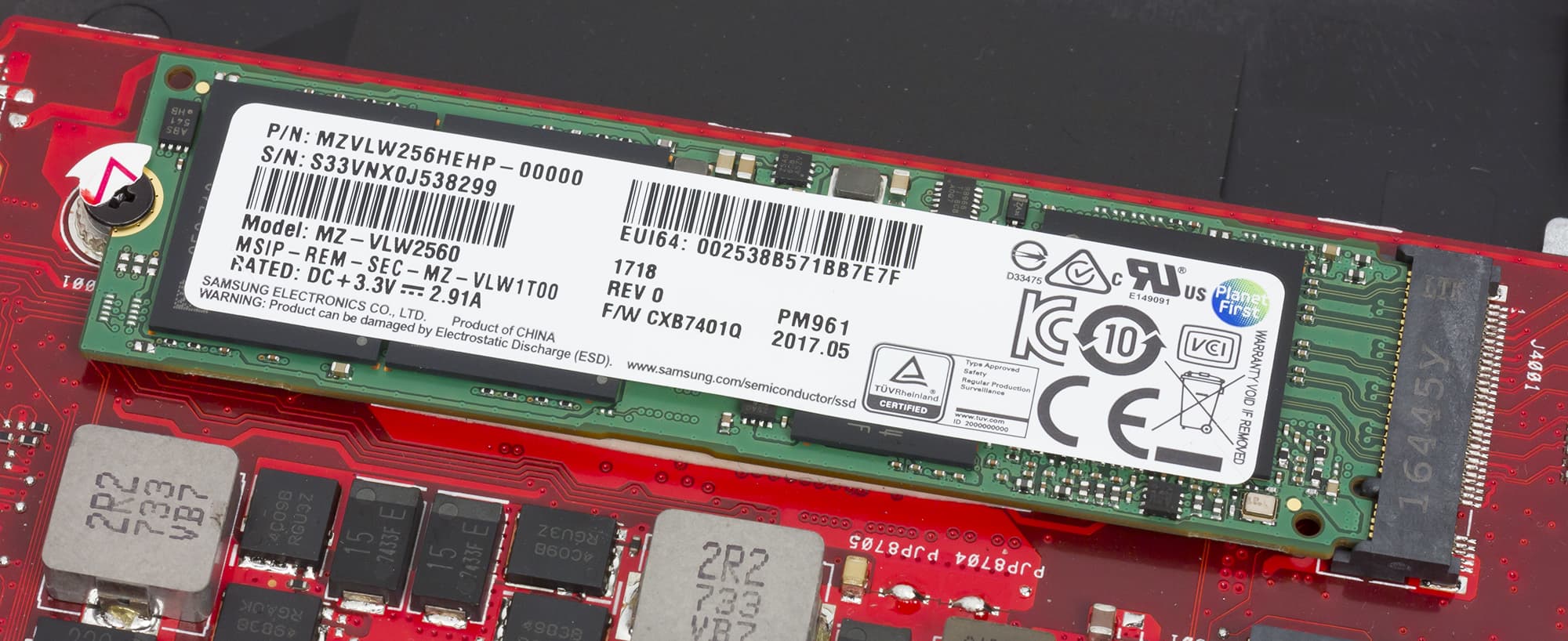 SSD-накопитель Samsung MZVLW256 установлен в разъем M.2 и имеет форм-фактор 2280. Интерфейс — PCIe 3.0 x4.