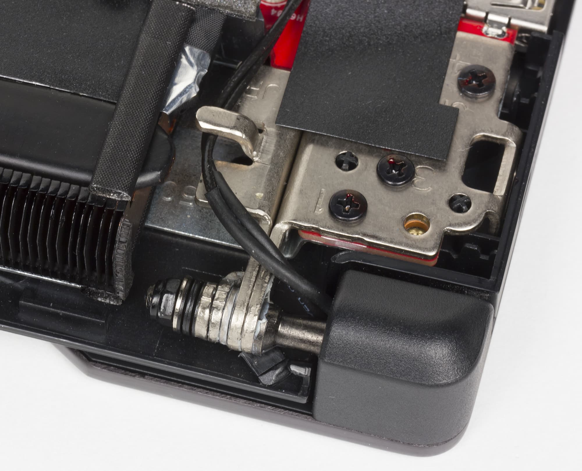 Система крепления экрана ноутбука к корпусу представляет собой две шарнирных петли, которые расположены в нижней части экрана. Такая система крепления позволяет отклонять экран относительно плоскости клавиатуры на угол примерно в 120 градусов.