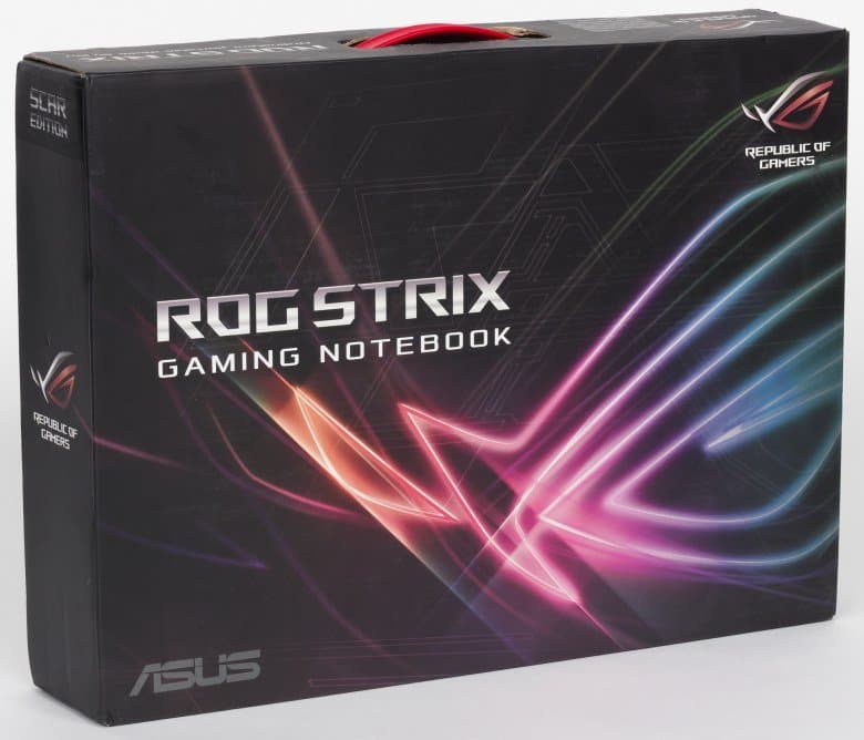 Ноутбук Asus ROG Strix GL503V Scar Edition поставляется в небольшой картонной коробке черного цвета с ручкой.